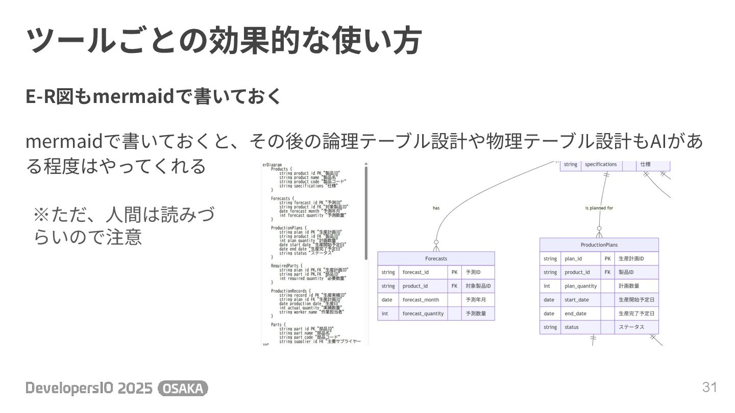 ツールごとの効果的な使い⽅ 31 E-R図もmermaidで書いておく mermaidで書いておくと、その後の論理テーブル設計や物理テーブル設計もAIがあ る程度はやってくれる ※ただ、⼈間は読みづ らいので注意
