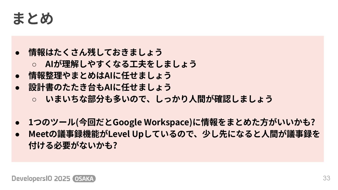 ◦ いまいちな部分も多いので、しっかり⼈間が確認しましょう • 1つのツール(今回だとGoogle Workspace)に情報をまとめた⽅がいいかも? • Meetの議事録機能がLevel Upしているので、少し先になると⼈間が議事録を 付ける必要がないかも?