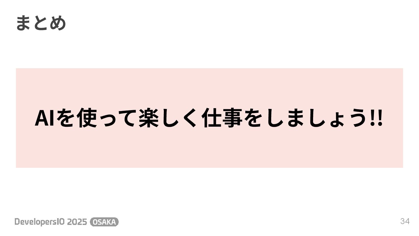 まとめ 33 • 情報はたくさん残しておきましょう ◦ AIが理解しやすくなる⼯夫をしましょう • 情報整理やまとめはAIに任せましょう • 設計書のたたき台もAIに任せましょう