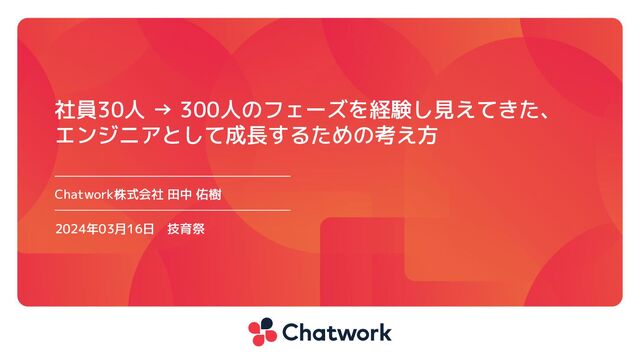 Chatwork株式会社 田中 佑樹 2024年03月16日 技育祭 社員30人 → 300人のフェーズを経験し見えてきた、 エンジニアとして成長するための考え方