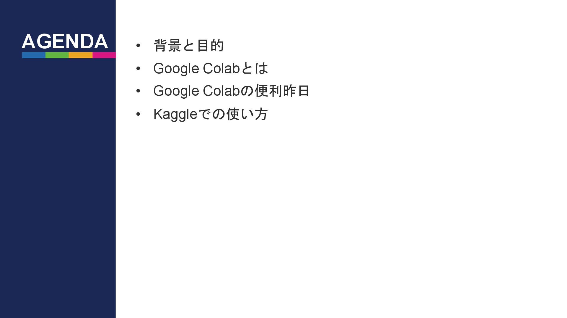 AGENDA AGENDA • 背景と目的 • Google Colabとは • Google Colabの便利昨日