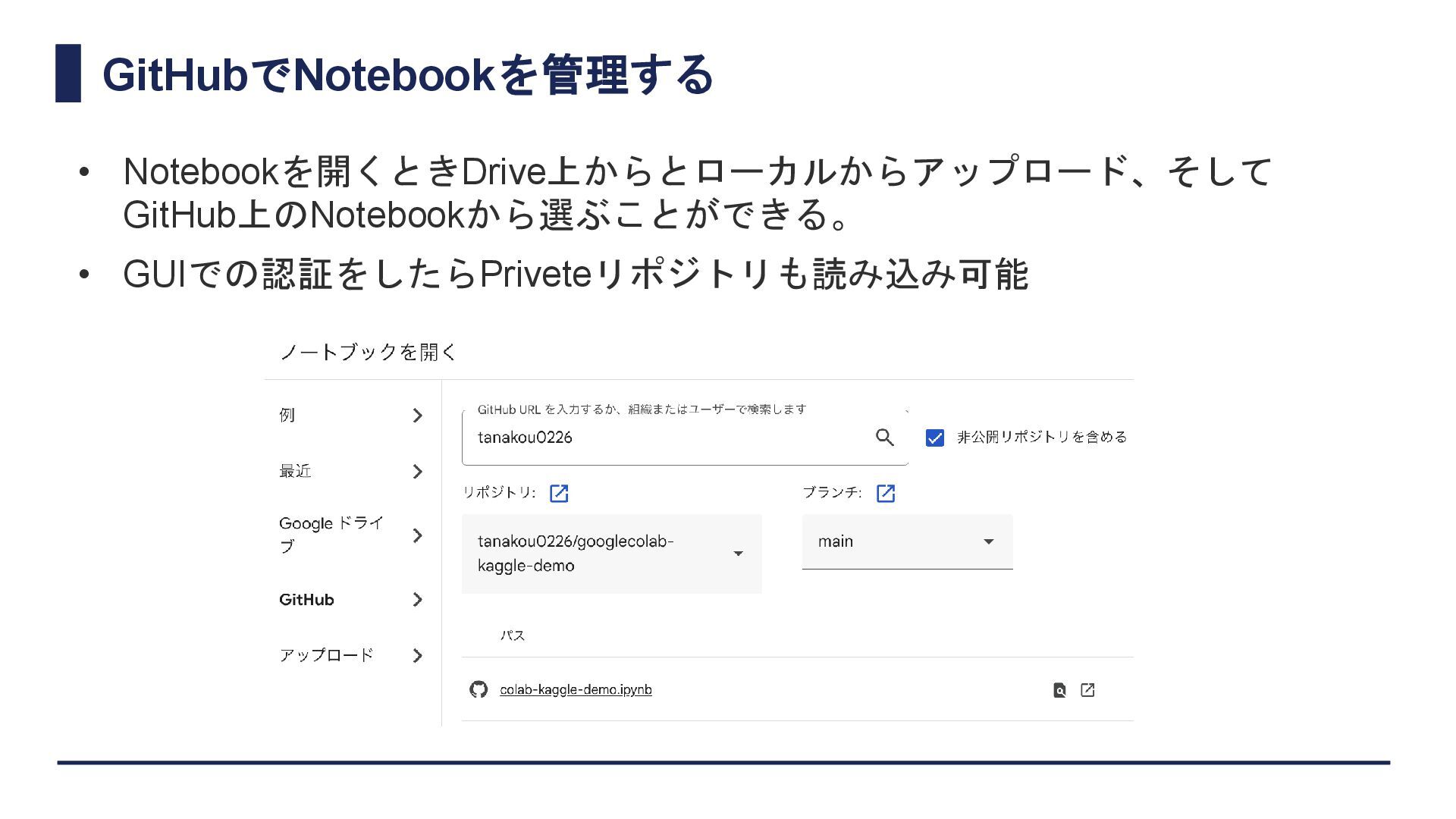 • Notebookを開くときDrive上からとローカルからアップロード、そして GitHub上のNotebookから選ぶことができる。 • GUIでの認証をしたらPriveteリポジトリも読み込み可能 GitHubでNotebookを管理する