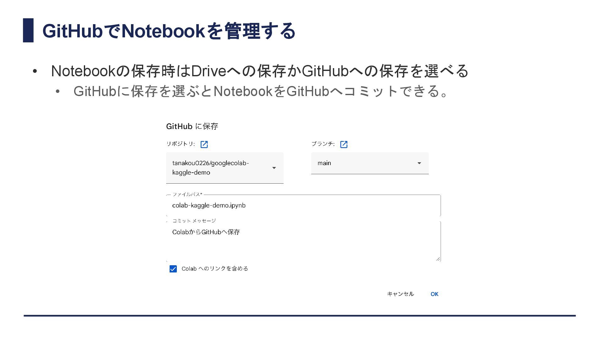 • Notebookの保存時はDriveへの保存かGitHubへの保存を選べる • GitHubに保存を選ぶとNotebookをGitHubへコミットできる。 GitHubでNotebookを管理する