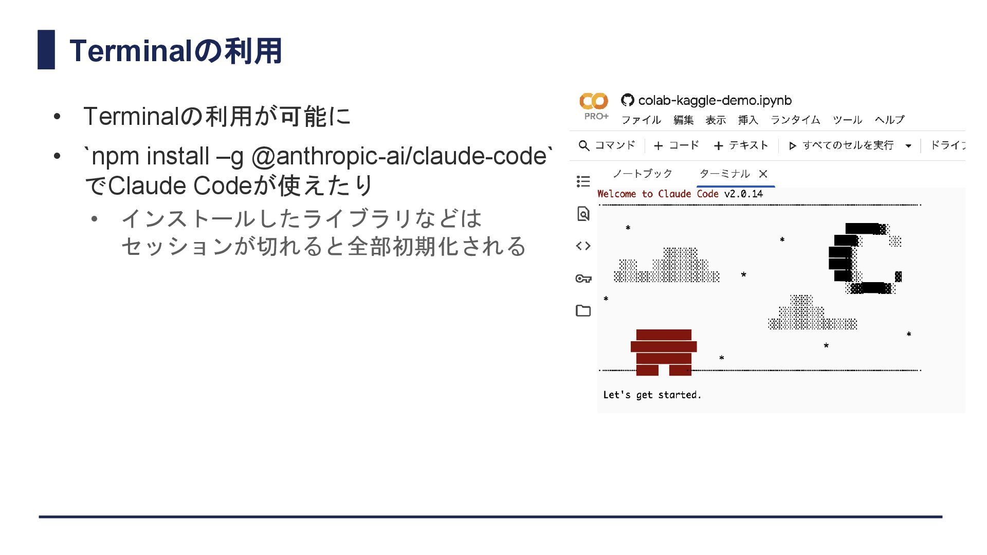 • Terminalの利用が可能に • `npm install –g @anthropic-ai/claude-code` でClaude Codeが使えたり •