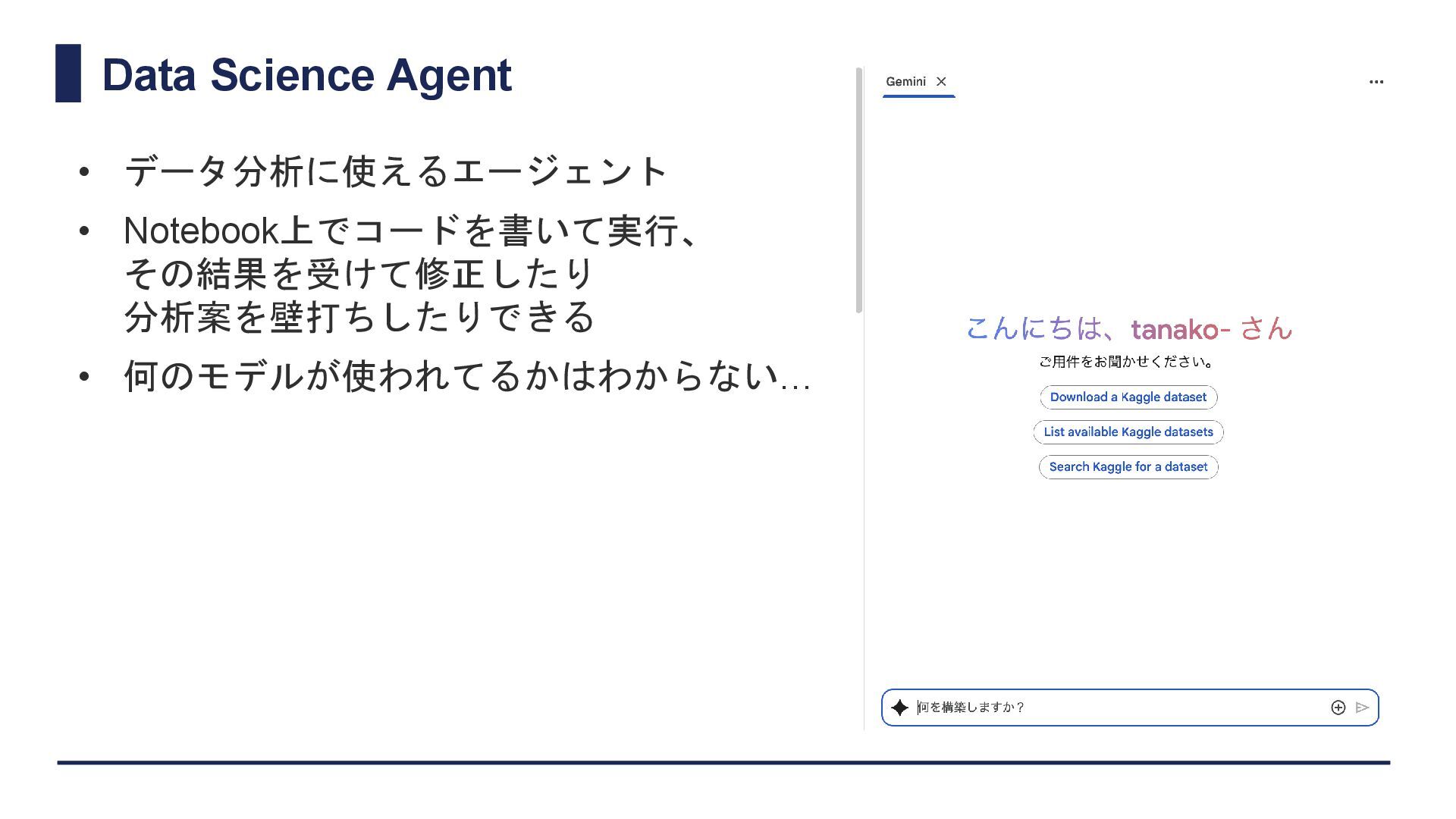 • データ分析に使えるエージェント • Notebook上でコードを書いて実行、 その結果を受けて修正したり 分析案を壁打ちしたりできる • 何のモデルが使われてるかはわからない… Data Science