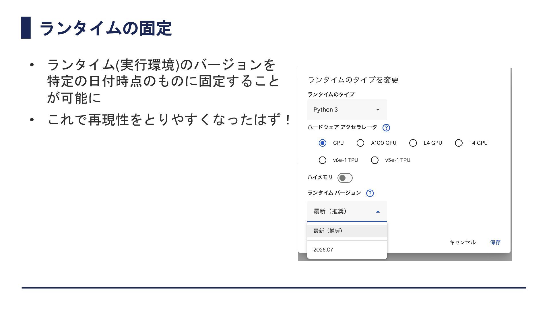 • ランタイム(実行環境)のバージョンを 特定の日付時点のものに固定すること が可能に • これで再現性をとりやすくなったはず! ランタイムの固定