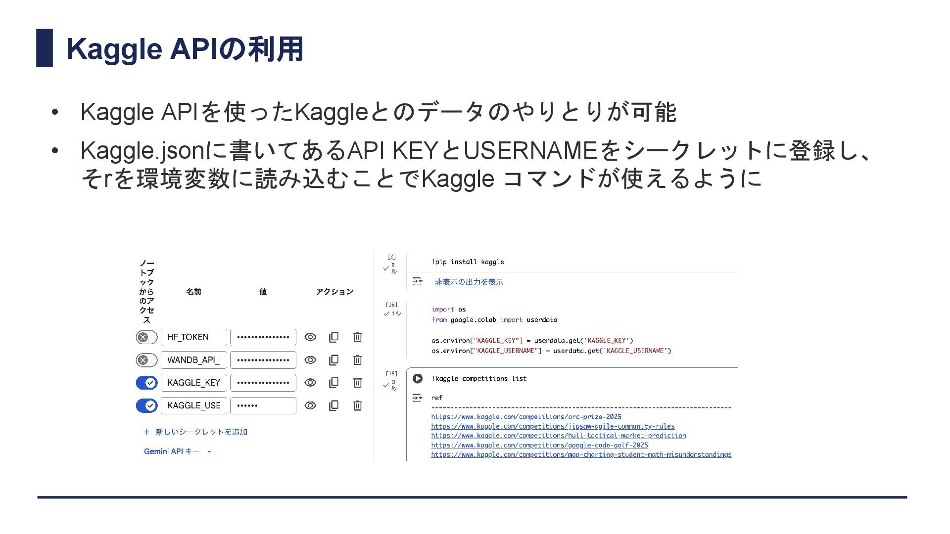 • Kaggle APIを使ったKaggleとのデータのやりとりが可能 • Kaggle.jsonに書いてあるAPI KEYとUSERNAMEをシークレットに登録し、 そrを環境変数に読み込むことでKaggle コマンドが使えるように Kaggle APIの利用