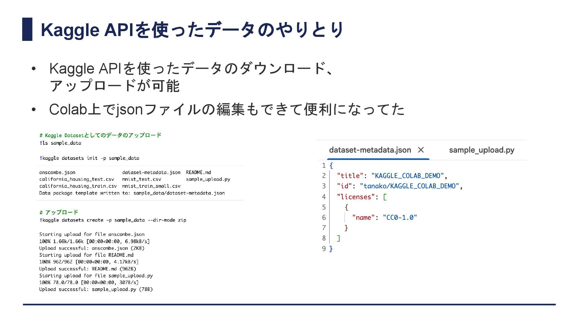 • Kaggle APIを使ったデータのダウンロード、 アップロードが可能 • Colab上でjsonファイルの編集もできて便利になってた Kaggle APIを使ったデータのやりとり
