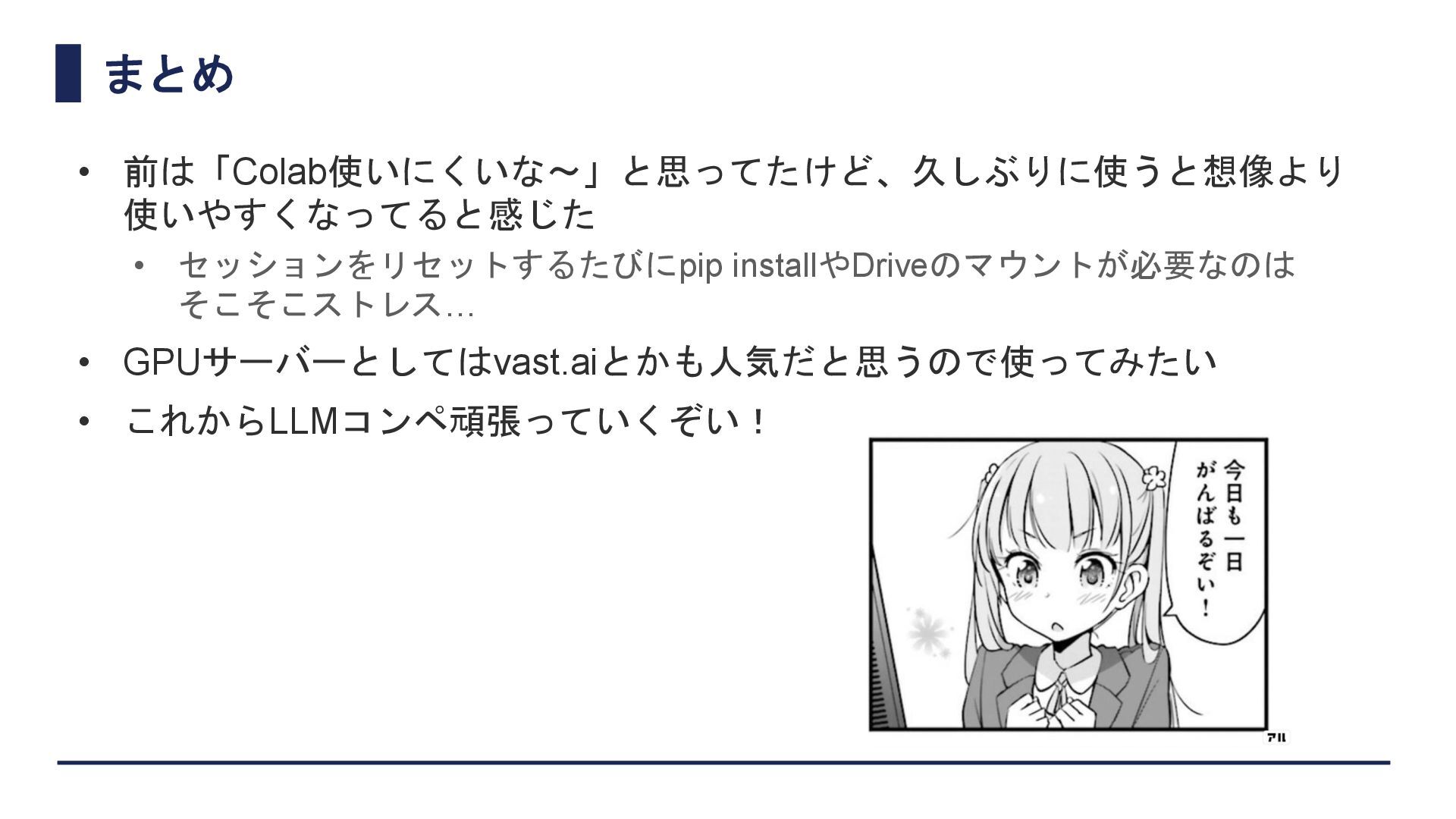 • 前は「Colab使いにくいな〜」と思ってたけど、久しぶりに使うと想像より 使いやすくなってると感じた • セッションをリセットするたびにpip installやDriveのマウントが必要なのは そこそこストレス… • GPUサーバーとしてはvast.aiとかも人気だと思うので使ってみたい •