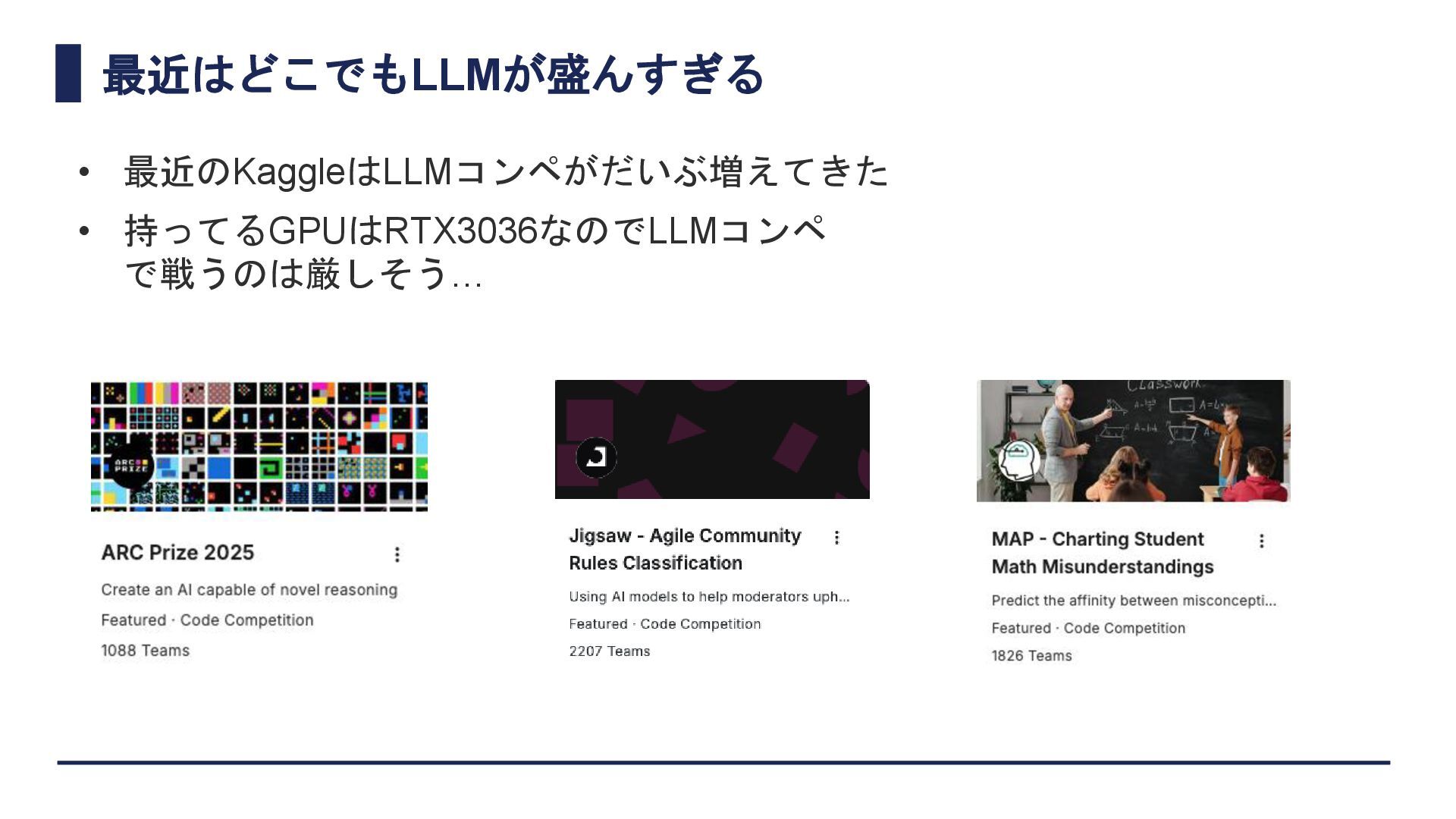 • 最近のKaggleはLLMコンペがだいぶ増えてきた • 持ってるGPUはRTX3036なのでLLMコンペ で戦うのは厳しそう… 最近はどこでもLLMが盛んすぎる