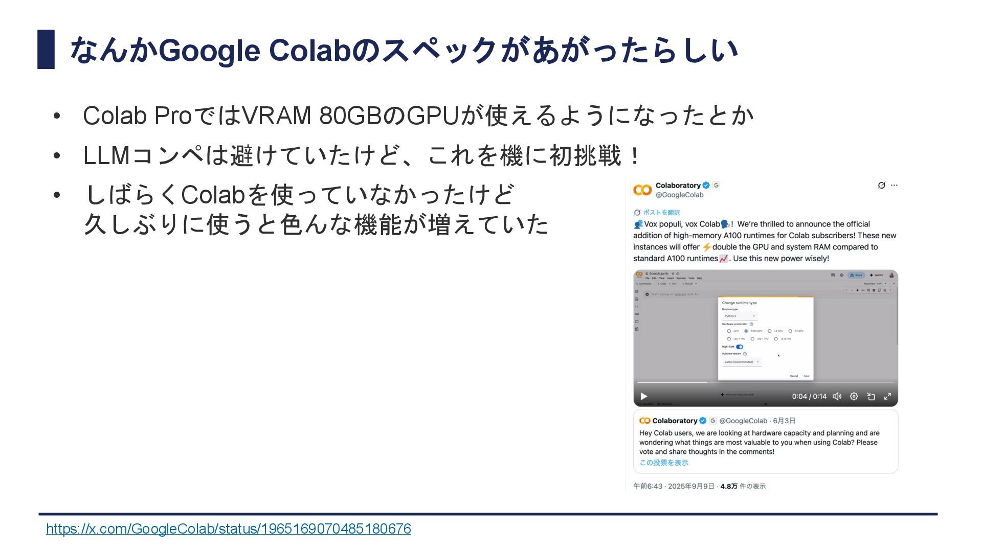 • Colab ProではVRAM 80GBのGPUが使えるようになったとか • LLMコンペは避けていたけど、これを機に初挑戦! • しばらくColabを使っていなかったけど 久しぶりに使うと色んな機能が増えていた なんかGoogle