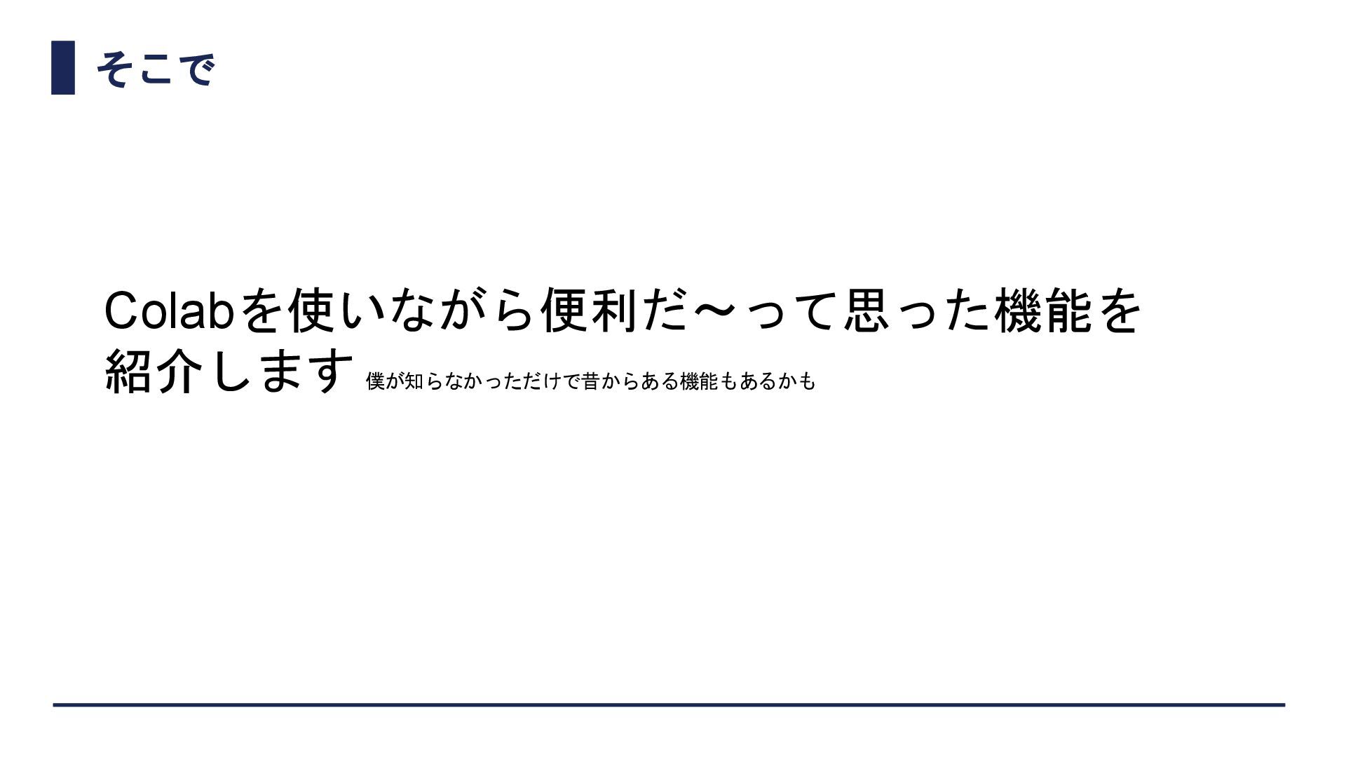 そこで 僕が知らなかっただけで昔からある機能もあるかも Colabを使いながら便利だ〜って思った機能を 紹介します