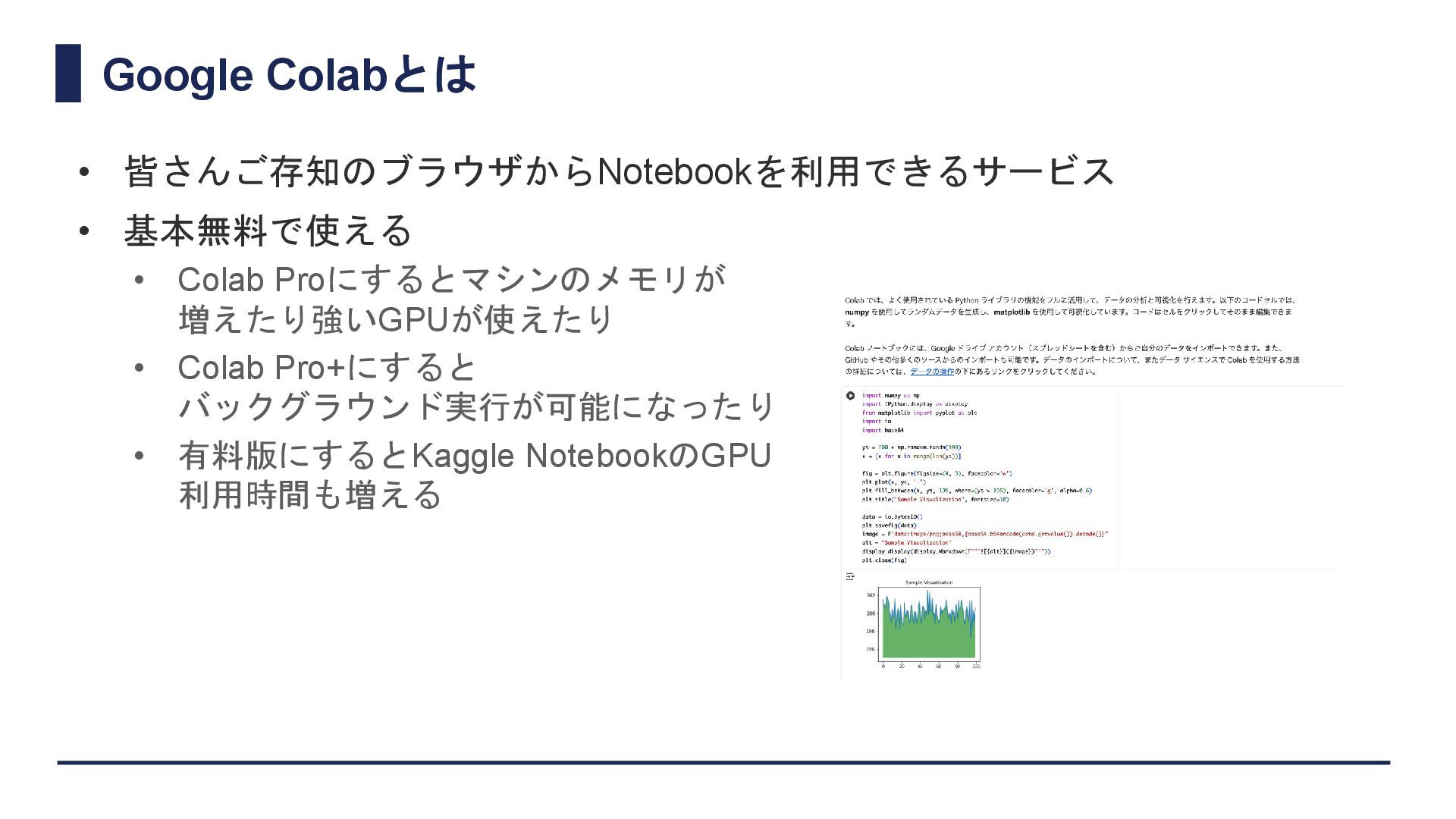 • 皆さんご存知のブラウザからNotebookを利用できるサービス • 基本無料で使える • Colab Proにするとマシンのメモリが 増えたり強いGPUが使えたり • Colab