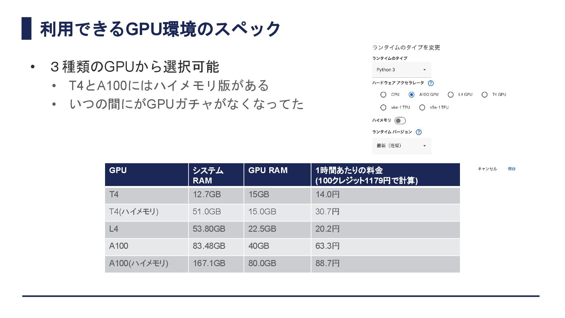 • 3種類のGPUから選択可能 • T4とA100にはハイメモリ版がある • いつの間にがGPUガチャがなくなってた 利用できるGPU環境のスペック GPU システム RAM