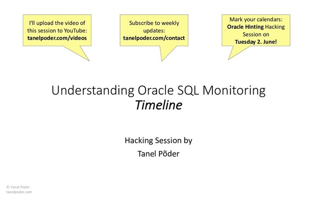 of Oracle SQL Monitor • by Maria Colgan • https://sqlmaria.com/2017/08/01/getting-the-most-out-of-oracle-sql-monitor/ • Previous SQL Monitoring Hacking Sessions • By me • https://tanelpoder.com/videos/ • Execution plans • by Jonathan Lewis • https://jonathanlewis.wordpress.com/2020/05/05/execution-plans-5/ • Virtual Conference (28-29 September 2020) • https://tanelpoder.com/conference Useful material (that I won't cover here much)