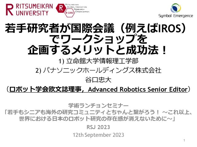 @IEEE IROS2023 8 Organizers 1. Tadahiro Taniguchi, Ritsumeikan University, 2. Emre Ugur, Bogazici University, 3. Masahiro Suzuki, The University of Tokyo, 4. Dimitri Ognibene, Università degli Studi di Milano-Bicocca, 5. Lorenzo Jamone, Queen Mary University of London 6. Yukie Nagai, The University of Tokyo, 7. Tatsuya Matsushima, The University of Tokyo, 8. Tetsunari Inamura, Tamagawa University, T. Matsubara G. Sandini P. Lanillos T. Ogata + 7 poster presentations 来てね!