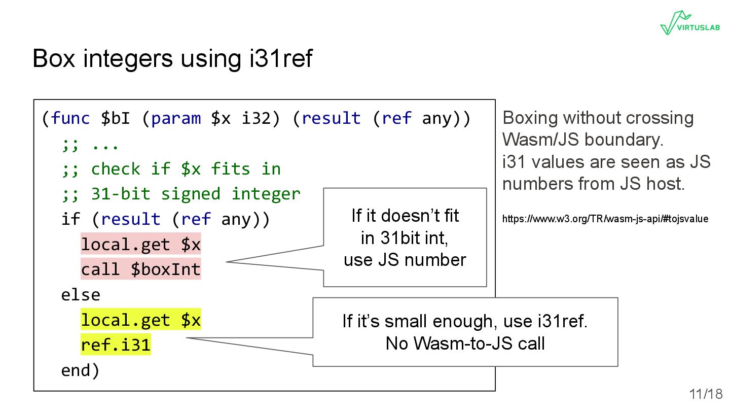 i32) (result anyref))) (import "__scalaJSHelpers" "unboxInt" (func $unboxInt (param anyref) (result i32))) // JavaScript helper boxInt: (x) => x, unboxInt: (x) => x, Reference to JS number but calling JS from Wasm is expensive Convert between i32 ⇔ JS number 10/18