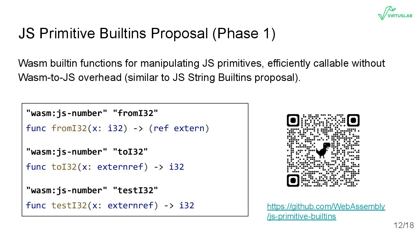 manipulating JS primitives, efficiently callable without Wasm-to-JS overhead (similar to JS String Builtins proposal). "wasm:js-number" "fromI32" func fromI32(x: i32) -> (ref extern) "wasm:js-number" "toI32" func toI32(x: externref) -> i32 "wasm:js-number" "testI32" func testI32(x: externref) -> i32 https://github.com/WebAssembly /js-primitive-builtins 12/18