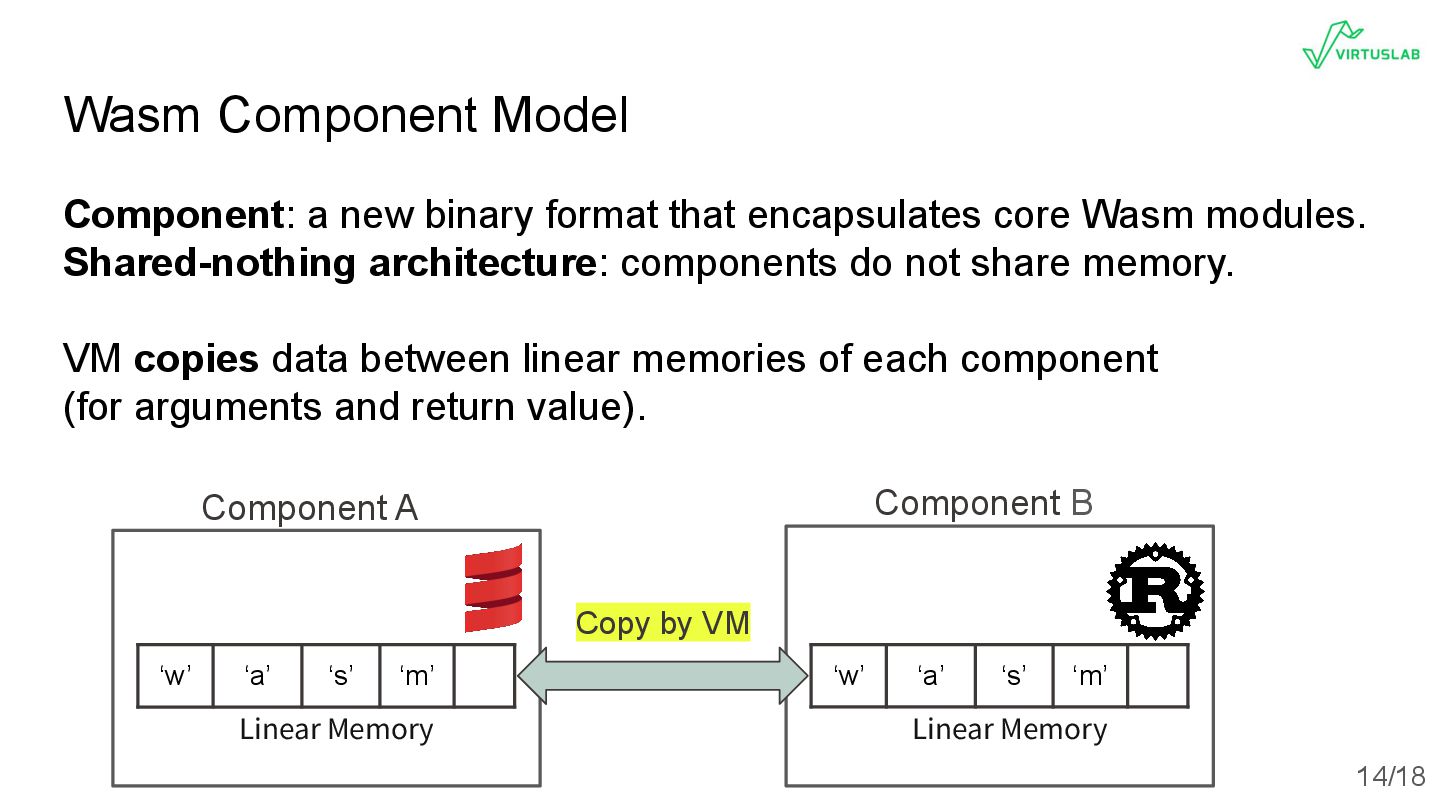 ‘a’ ‘s’ ‘m’ Linear Memory Copy by VM Component A Component B Component: a new binary format that encapsulates core Wasm modules. Shared-nothing architecture: components do not share memory. VM copies data between linear memories of each component (for arguments and return value). 14/18
