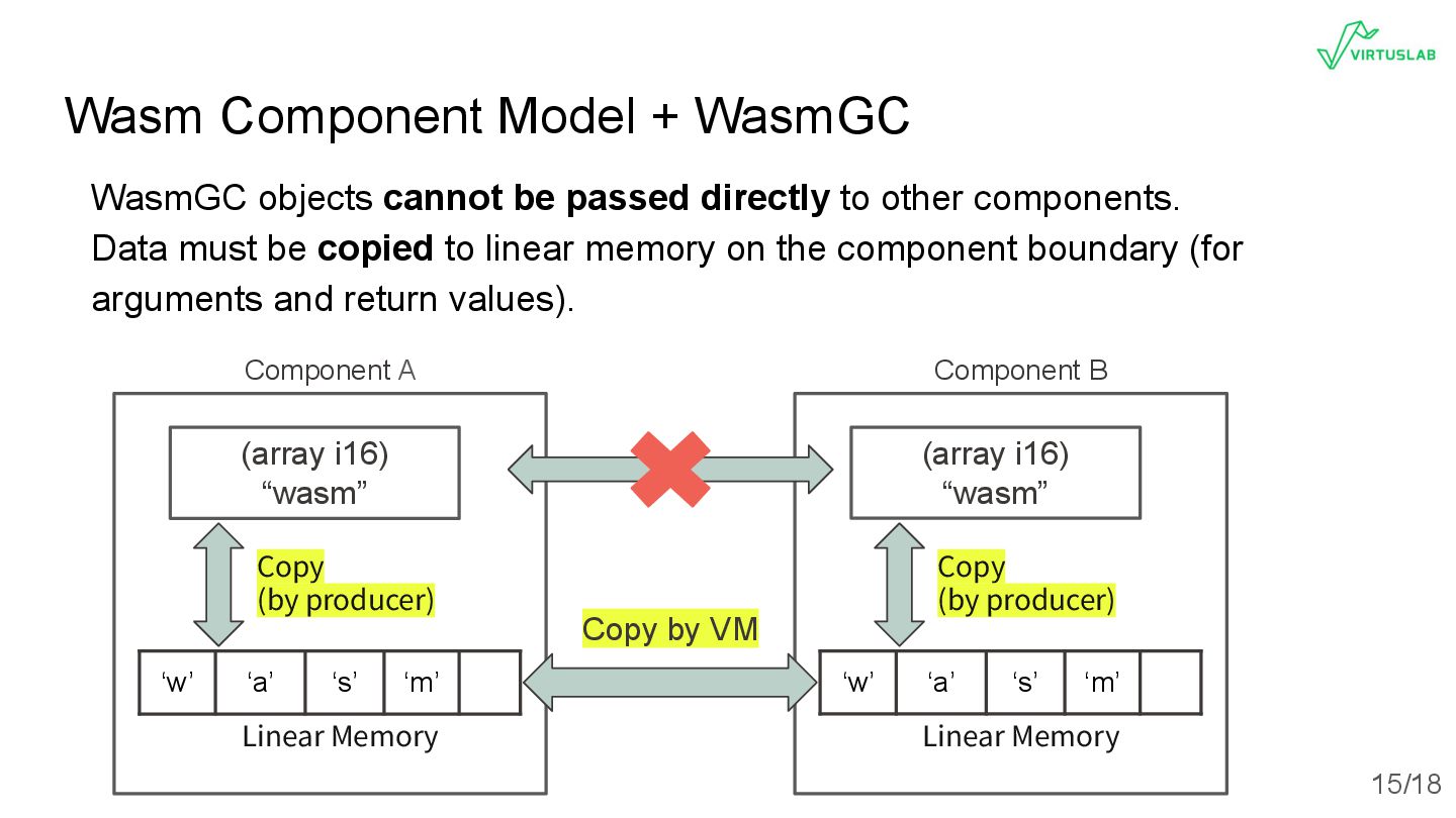 Memory Copy (by producer) (array i16) “wasm” ‘w’ ‘a’ ‘s’ ‘m’ Linear Memory Copy (by producer) (array i16) “wasm” Copy by VM WasmGC objects cannot be passed directly to other components. Data must be copied to linear memory on the component boundary (for arguments and return values). Component A Component B 15/18