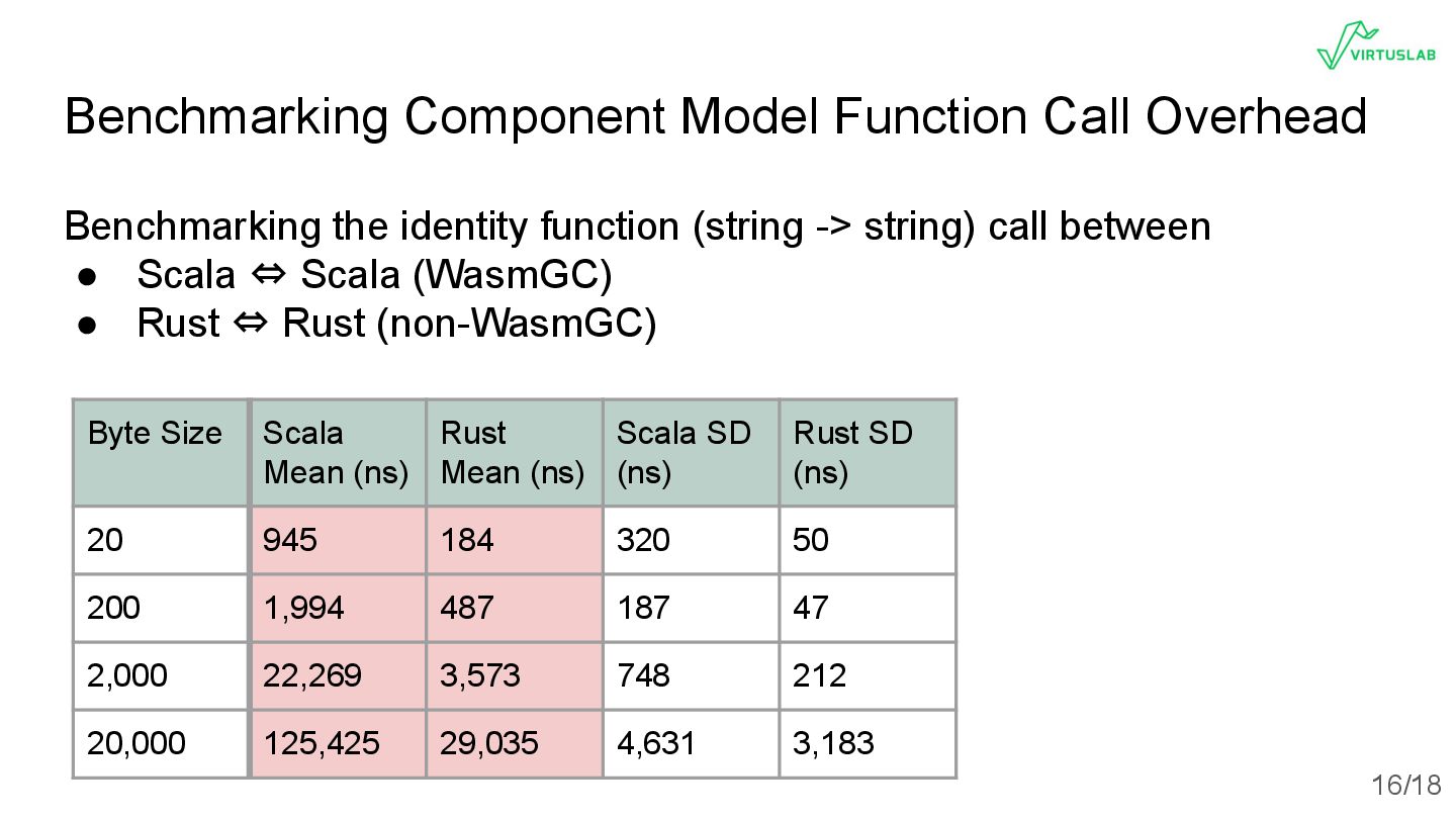 (ns) Rust Mean (ns) Scala SD (ns) Rust SD (ns) 20 945 184 320 50 200 1,994 487 187 47 2,000 22,269 3,573 748 212 20,000 125,425 29,035 4,631 3,183 Benchmarking the identity function (string -> string) call between • Scala ⇔ Scala (WasmGC) • Rust ⇔ Rust (non-WasmGC) 16/18
