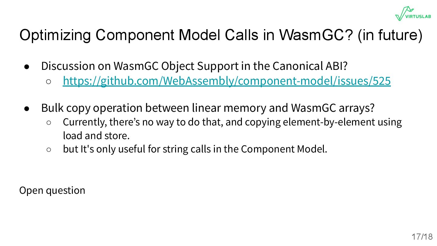 on WasmGC Object Support in the Canonical ABI? ◦ https://github.com/WebAssembly/component-model/issues/525 • Bulk copy operation between linear memory and WasmGC arrays? ◦ Currently, there’s no way to do that, and copying element-by-element using load and store. ◦ but It's only useful for string calls in the Component Model. Open question 17/18