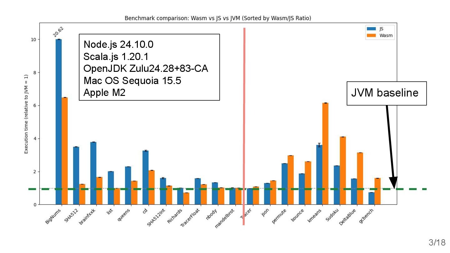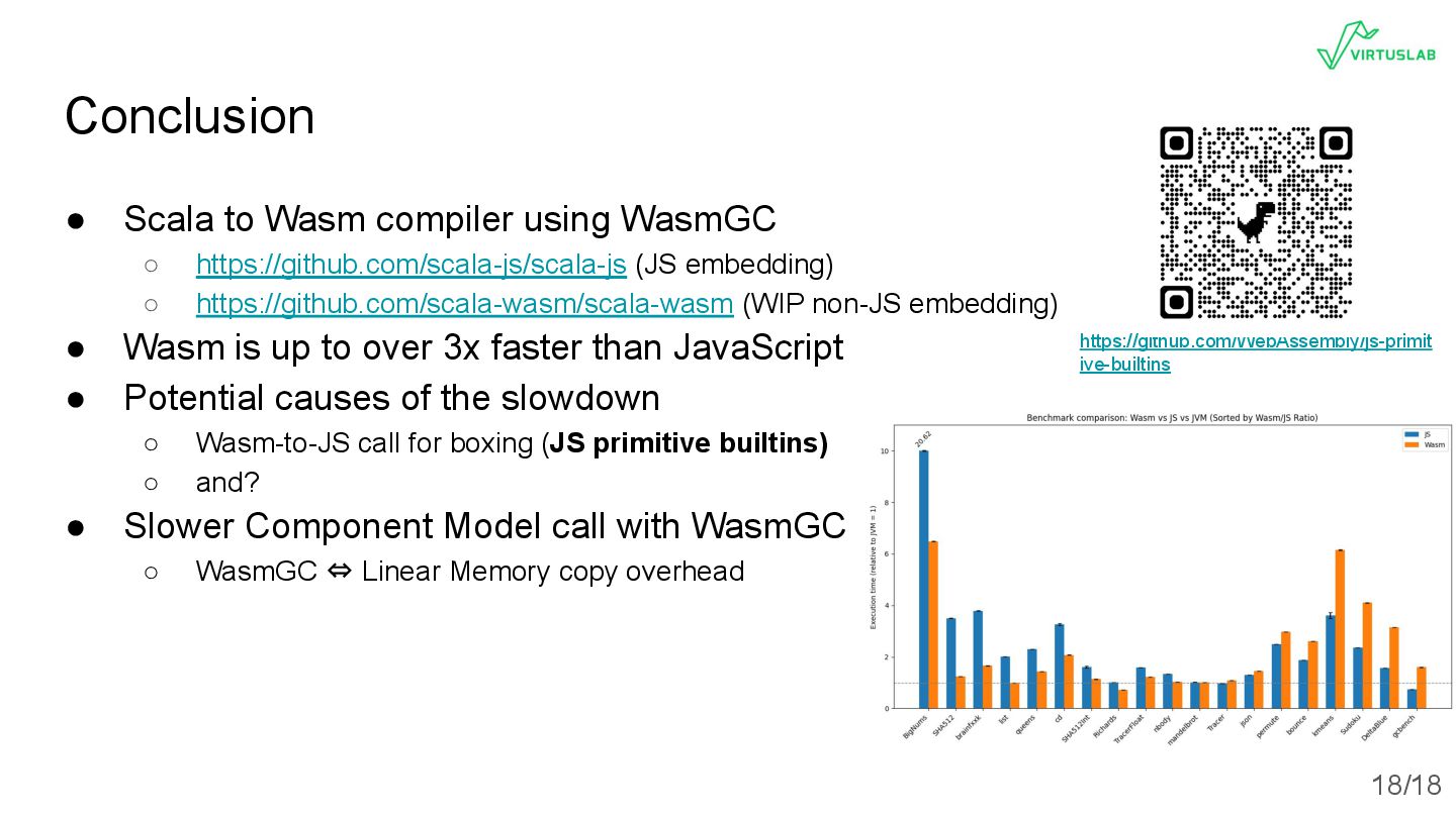 (JS embedding) ◦ https://github.com/scala-wasm/scala-wasm (WIP non-JS embedding) • Wasm is up to over 3x faster than JavaScript • Potential causes of the slowdown ◦ Wasm-to-JS call for boxing (JS primitive builtins) ◦ and? • Slower Component Model call with WasmGC ◦ WasmGC ⇔ Linear Memory copy overhead https://github.com/WebAssembly/js-primit ive-builtins 18/18
