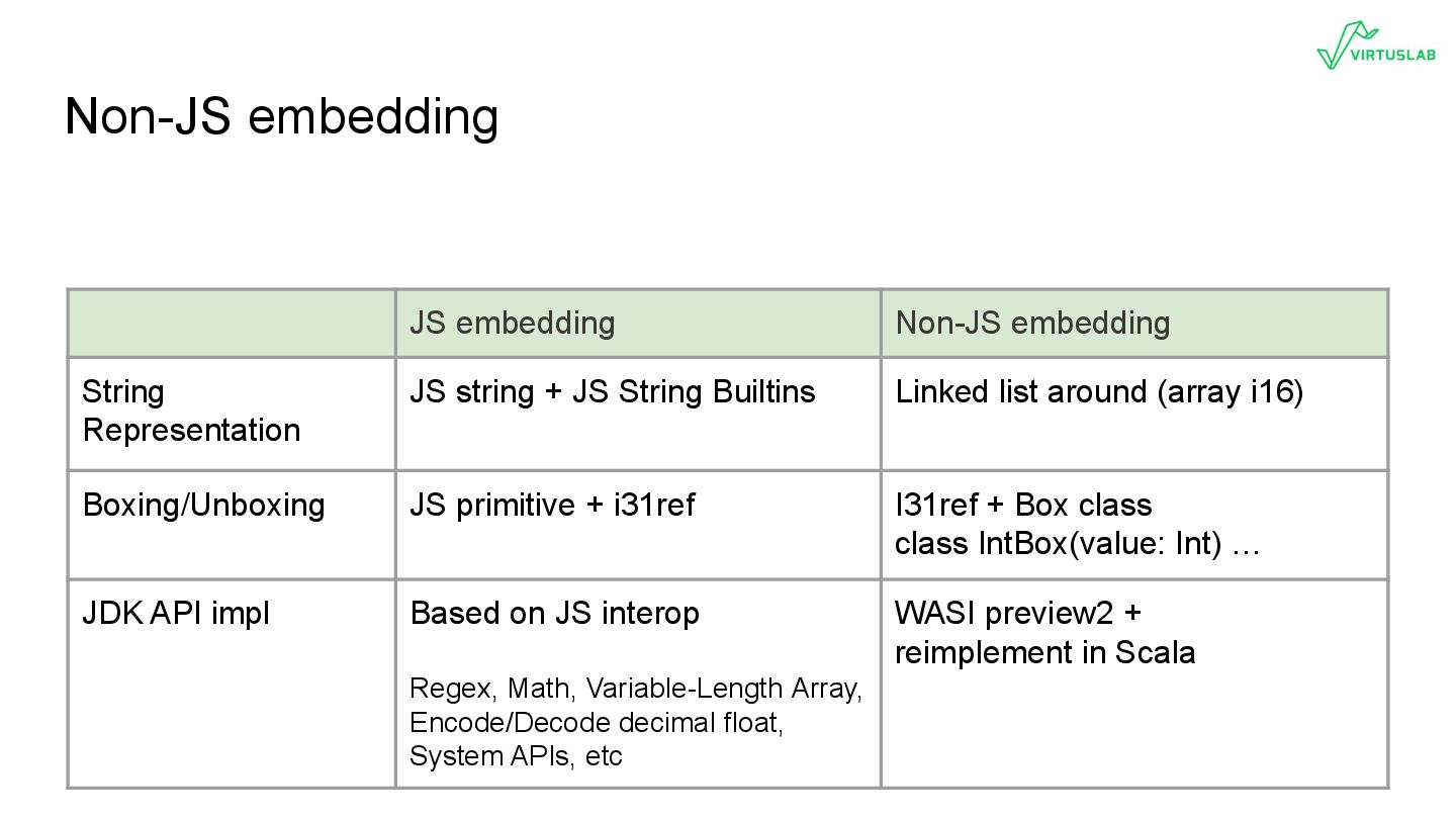 + JS String Builtins Linked list around (array i16) Boxing/Unboxing JS primitive + i31ref I31ref + Box class class IntBox(value: Int) … JDK API impl Based on JS interop Regex, Math, Variable-Length Array, Encode/Decode decimal float, System APIs, etc WASI preview2 + reimplement in Scala