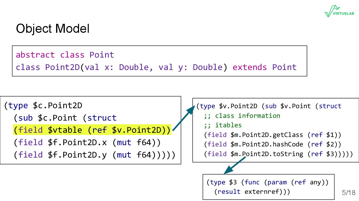$v.Point2D)) (field $f.Point2D.x (mut f64)) (field $f.Point2D.y (mut f64))))) (type $v.Point2D (sub $v.Point (struct ;; class information ;; itables (field $m.Point2D.getClass (ref $1)) (field $m.Point2D.hashCode (ref $2)) (field $m.Point2D.toString (ref $3))))) abstract class Point class Point2D(val x: Double, val y: Double) extends Point (type $3 (func (param (ref any)) (result externref))) 5/18