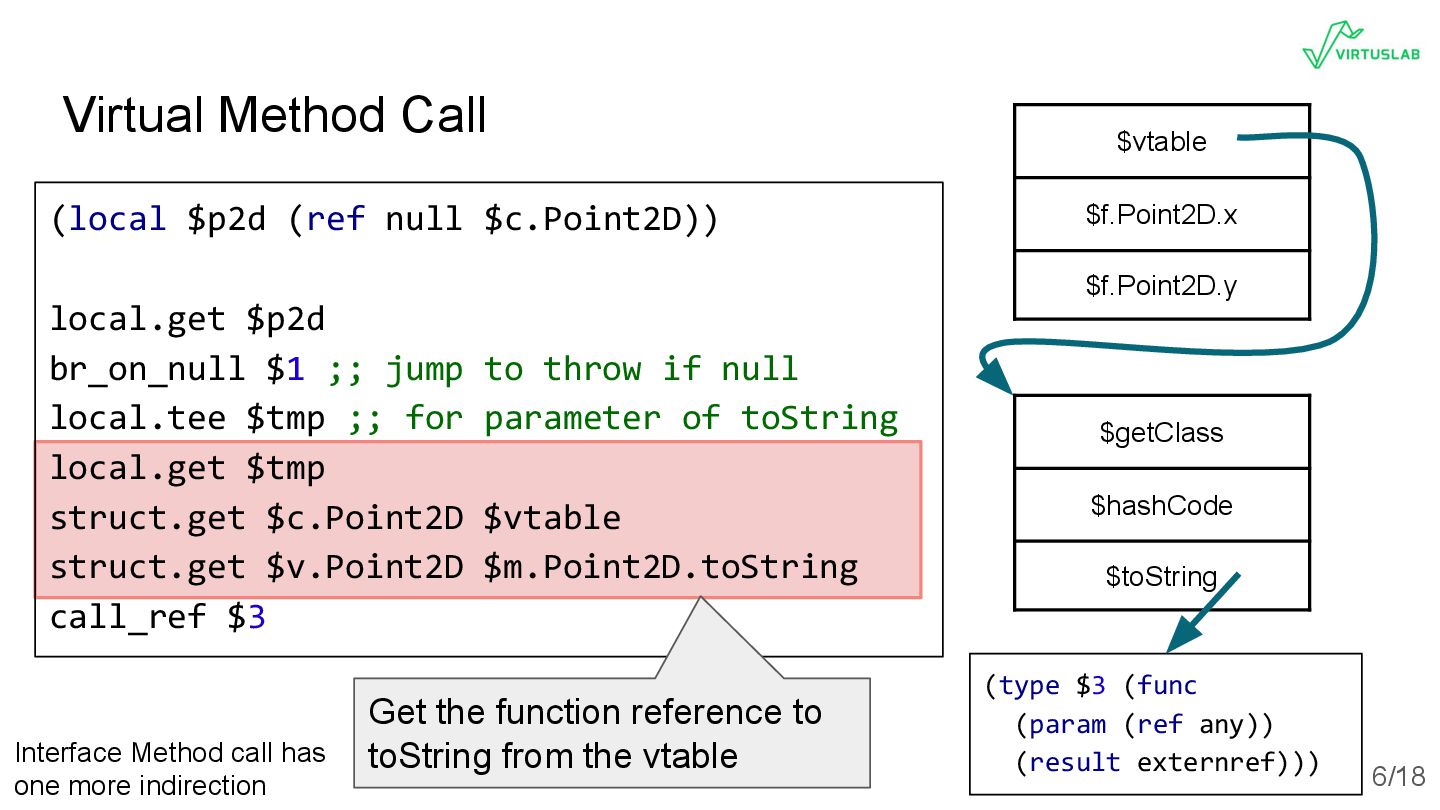 $c.Point2D)) local.get $p2d br_on_null $1 ;; jump to throw if null local.tee $tmp ;; for parameter of toString local.get $tmp struct.get $c.Point2D $vtable struct.get $v.Point2D $m.Point2D.toString call_ref $3 $getClass $hashCode $toString (type $3 (func (param (ref any)) (result externref))) Get the function reference to toString from the vtable Interface Method call has one more indirection 6/18