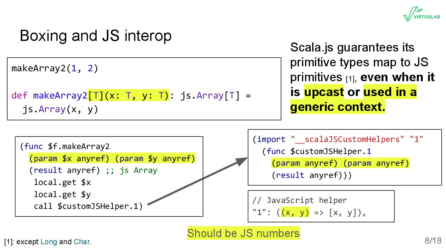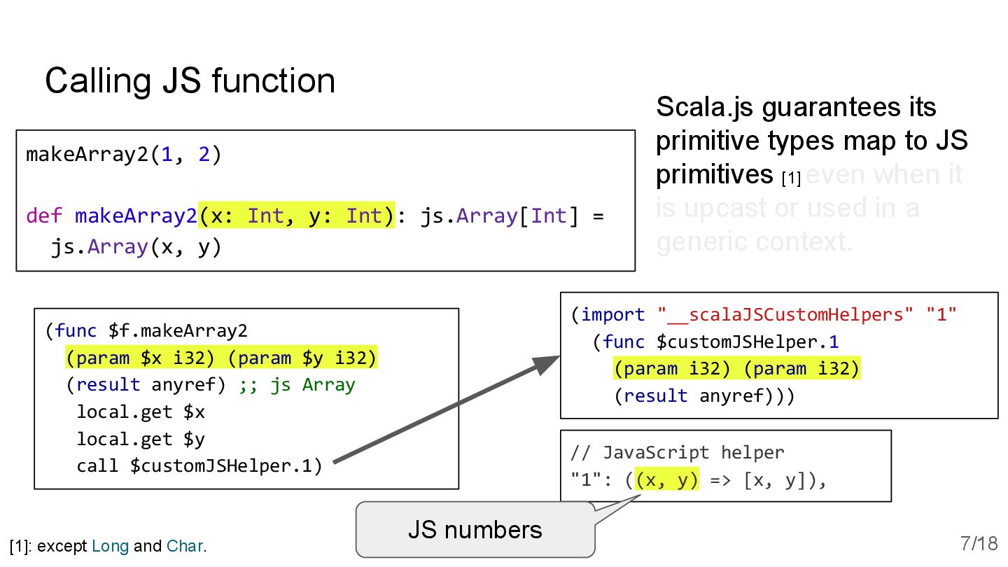 js.Array[Int] = js.Array(x, y) (func $f.makeArray2 (param $x i32) (param $y i32) (result anyref) ;; js Array local.get $x local.get $y call $customJSHelper.1) // JavaScript helper "1": ((x, y) => [x, y]), (import "__scalaJSCustomHelpers" "1" (func $customJSHelper.1 (param i32) (param i32) (result anyref))) [1]: except Long and Char. Scala.js guarantees its primitive types map to JS primitives [1] even when it is upcast or used in a generic context. JS numbers 7/18