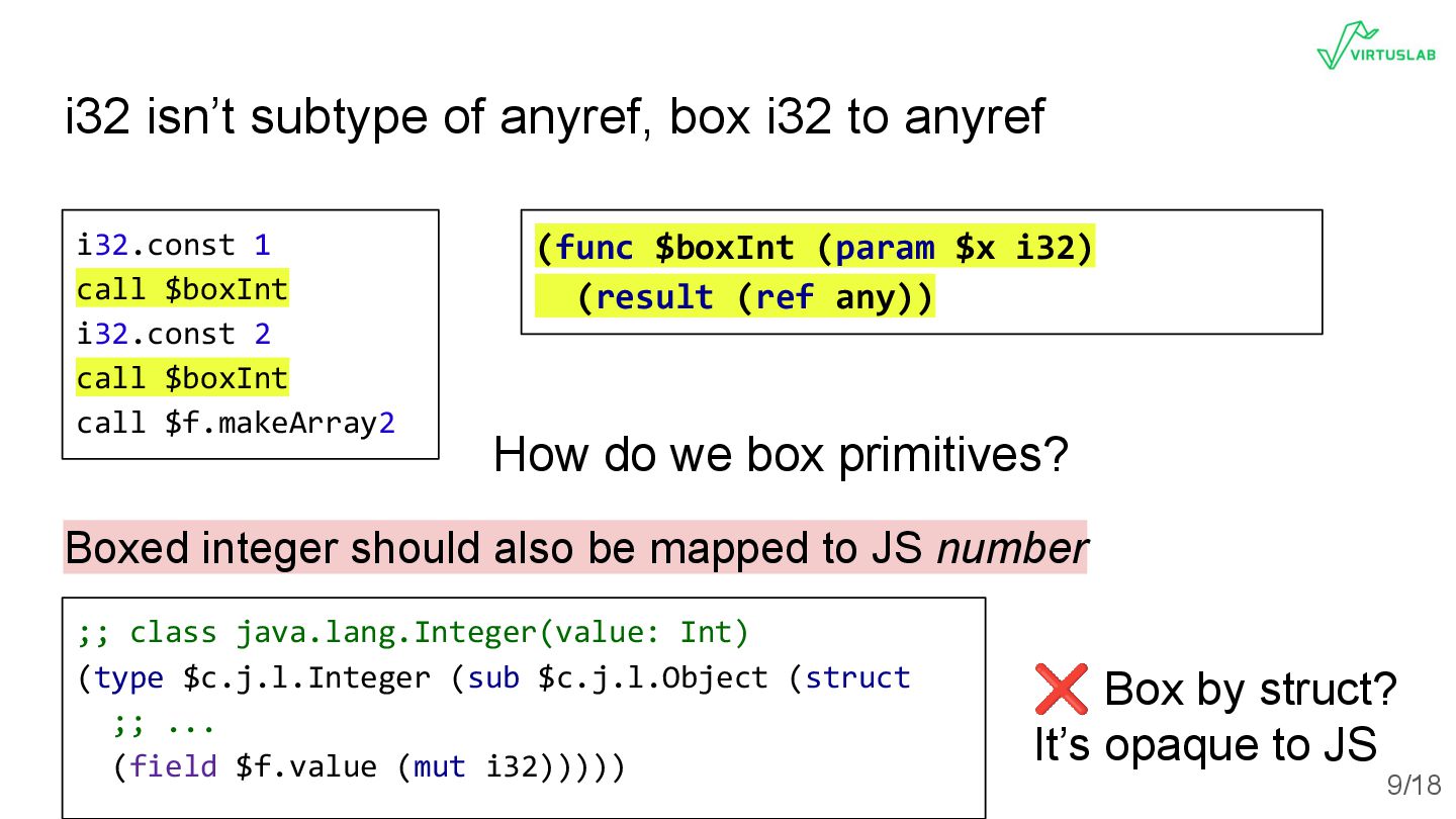 1 call $boxInt i32.const 2 call $boxInt call $f.makeArray2 Boxed integer should also be mapped to JS number (func $boxInt (param $x i32) (result (ref any)) How do we box primitives? ;; class java.lang.Integer(value: Int) (type $c.j.l.Integer (sub $c.j.l.Object (struct ;; ... (field $f.value (mut i32))))) ❌ Box by struct? It’s opaque to JS 9/18