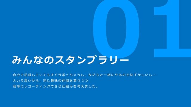 も す ぐ サ ボ っ ち ゃ う し 、 友 だ ち と 一 緒 に や る の も 恥 ず か し い し … と い う 思 い か ら 、 同 じ 趣 味 の 仲 間 を 募 り つ つ 簡 単 に レ コ ー デ ィ ン グ で き る 仕 組 み を 考 え ま し た 。