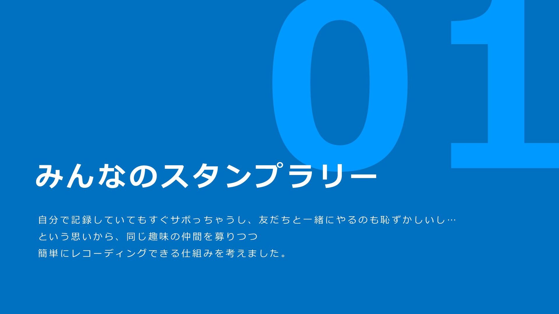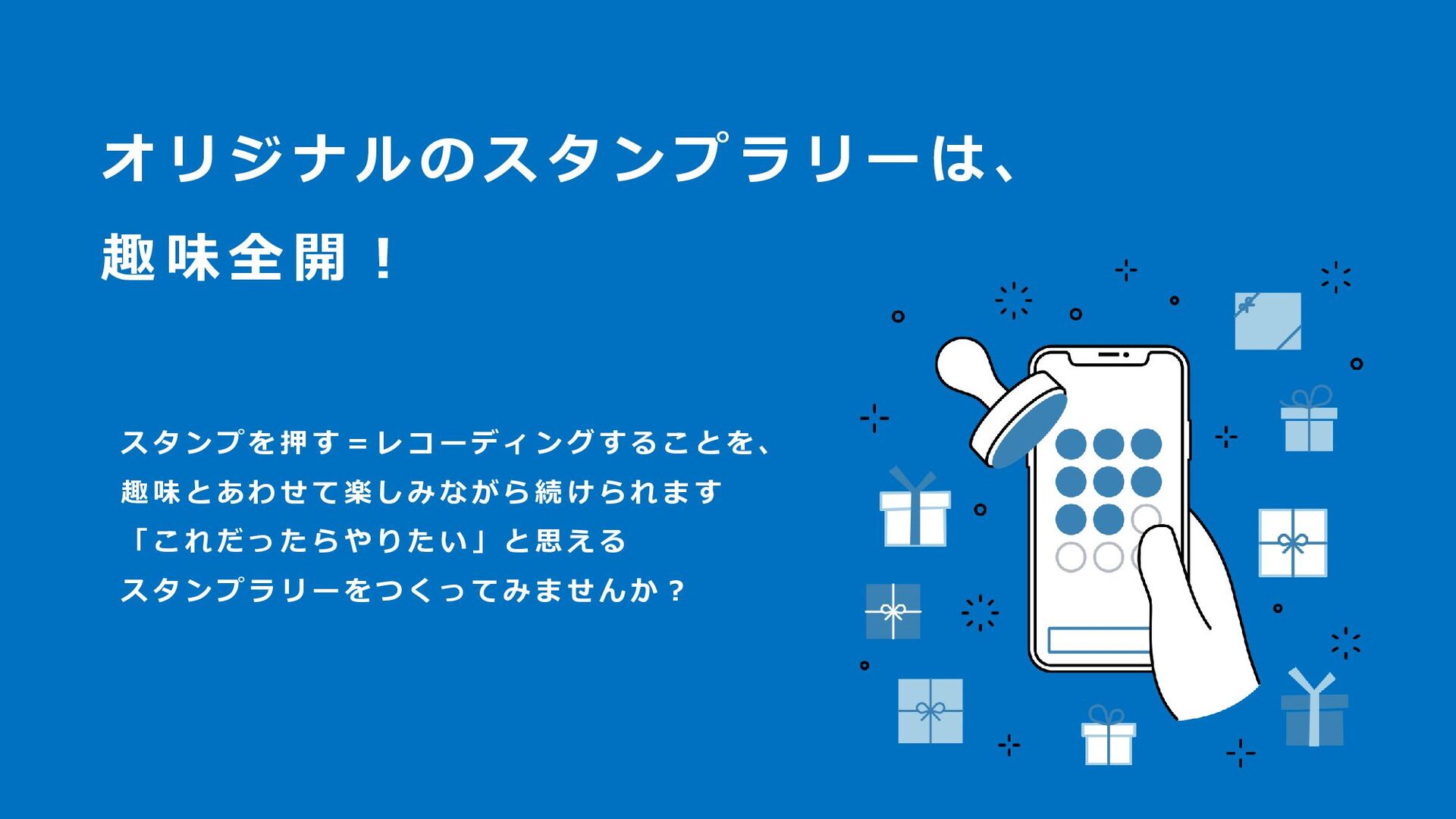 ラ リ ー は 、 趣 味 全 開 ! ス タ ン プ を 押 す = レ コ ー デ ィ ン グ す る こ と を 、 趣 味 と あ わ せ て 楽 し み な が ら 続 け ら れ ま す 「 こ れ だ っ た ら や り た い 」 と 思 え る ス タ ン プ ラ リ ー を つ く っ て み ま せ ん か ?