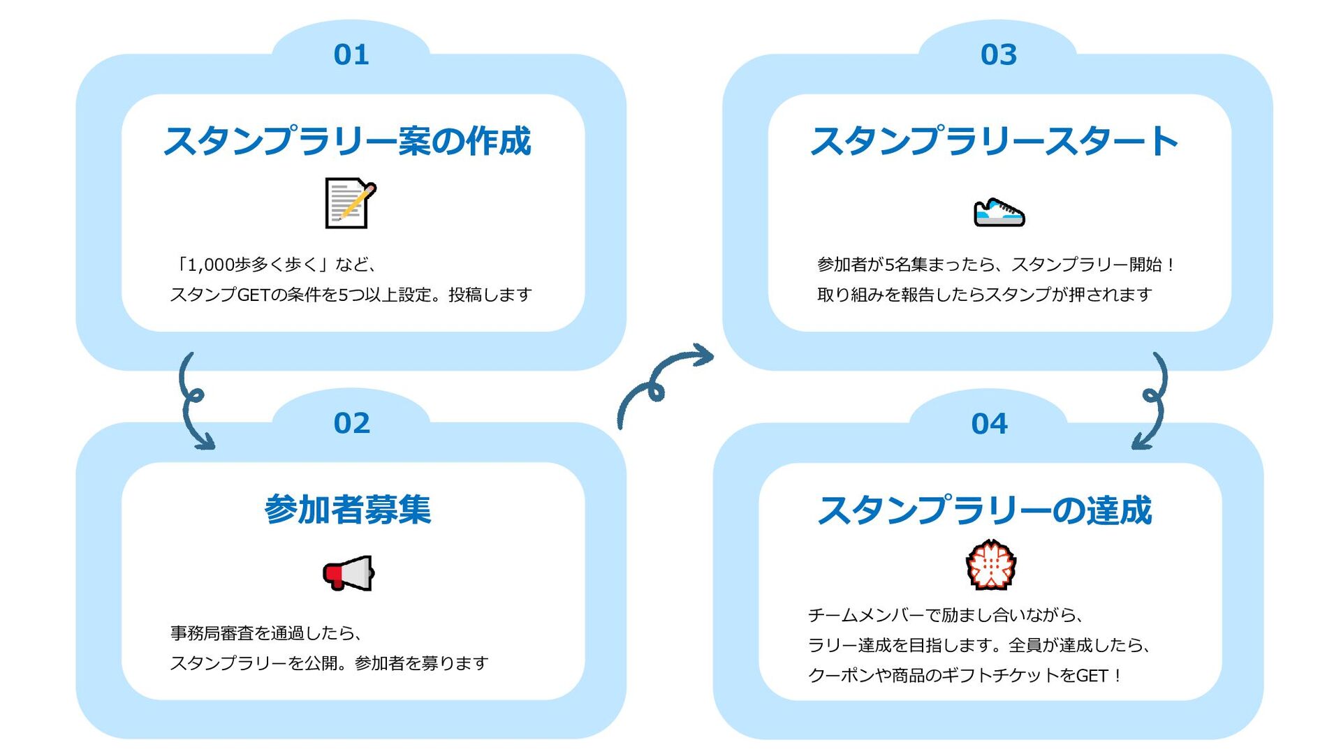 4. 01 「1,000歩多く歩く」など、 スタンプGETの条件を5つ以上設定。投稿します スタンプラリー案の作成 02 事務局審査を通過したら、 スタンプラリーを公開。参加者を募ります 参加者募集 03 参加者が5名集まったら、スタンプラリー開始!