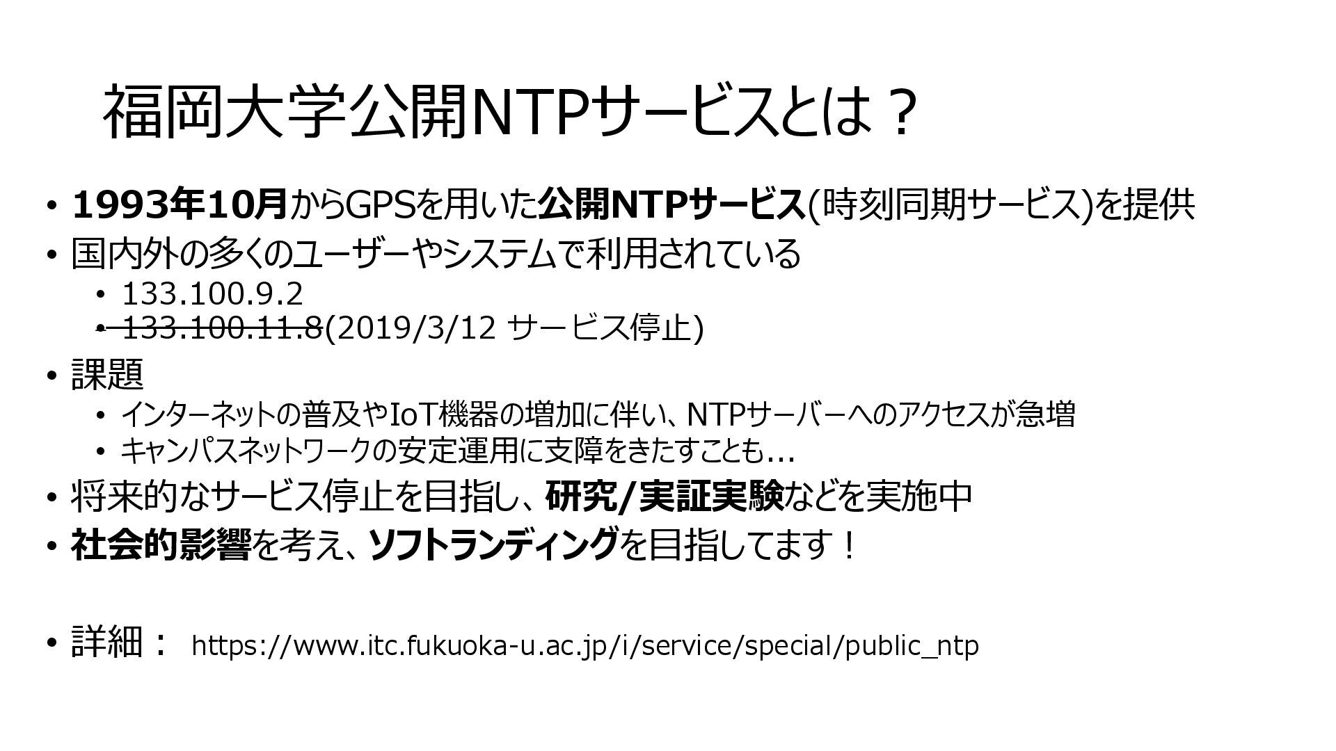 • 課題 • インターネットの普及やIoT機器の増加に伴い、NTPサーバーへのアクセスが急増 • キャンパスネットワークの安定運用に支障をきたすことも... • 将来的なサービス停止を目指し、研究/実証実験などを実施中 • 社会的影響を考え、ソフトランディングを目指してます! • 詳細: https://www.itc.fukuoka-u.ac.jp/i/service/special/public_ntp