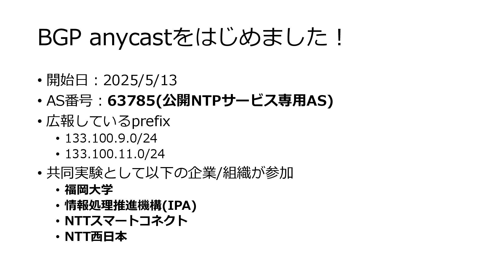 BGP anycastをはじめました! • 開始日:2025/5/13 • AS番号:63785(公開NTPサービス専用AS) • 広報しているprefix • 133.100.9.0/24