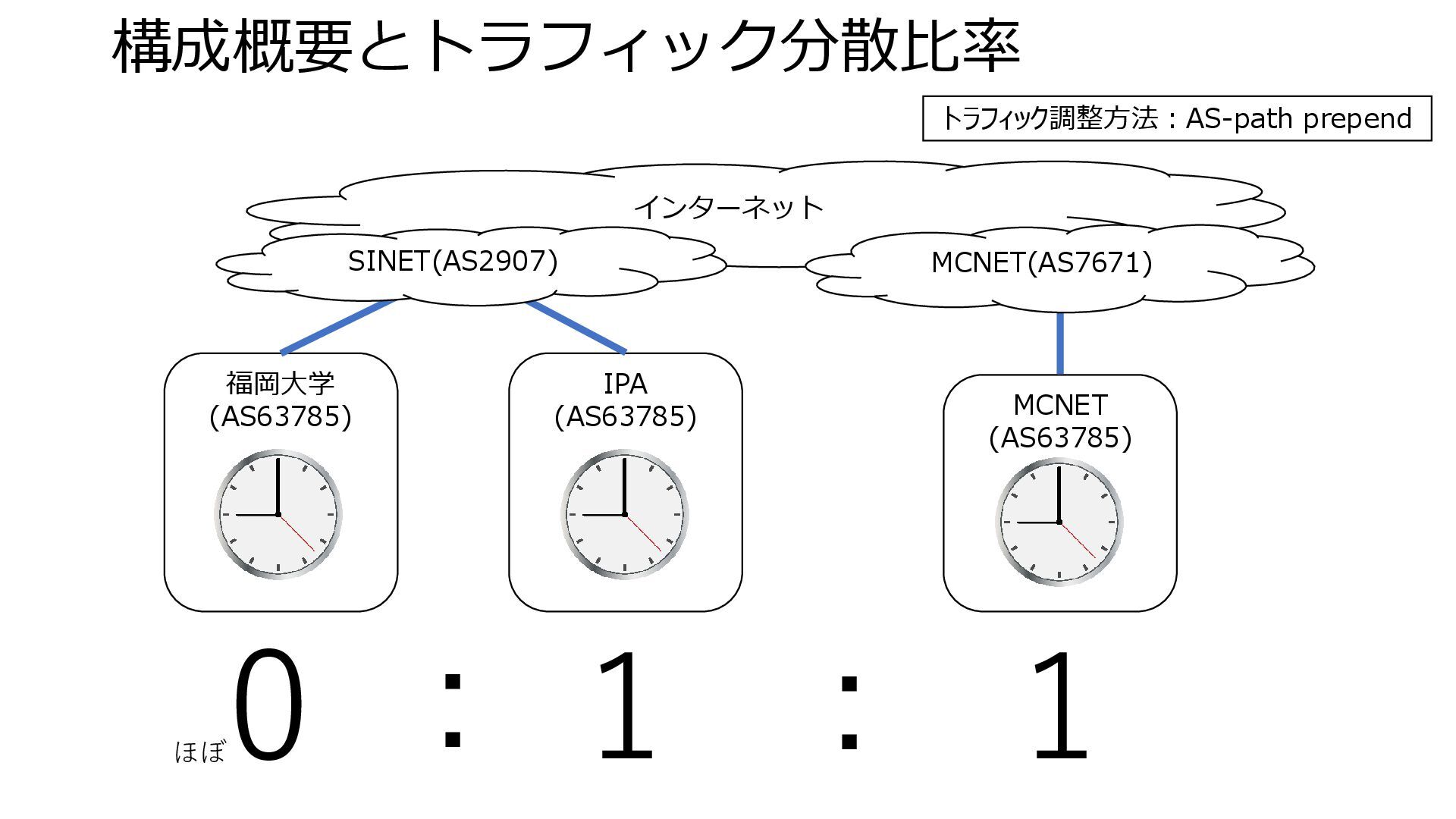 構成概要とトラフィック分散比率 福岡大学 (AS63785) IPA (AS63785) MCNET (AS63785) インターネット SINET(AS2907) MCNET(AS7671)