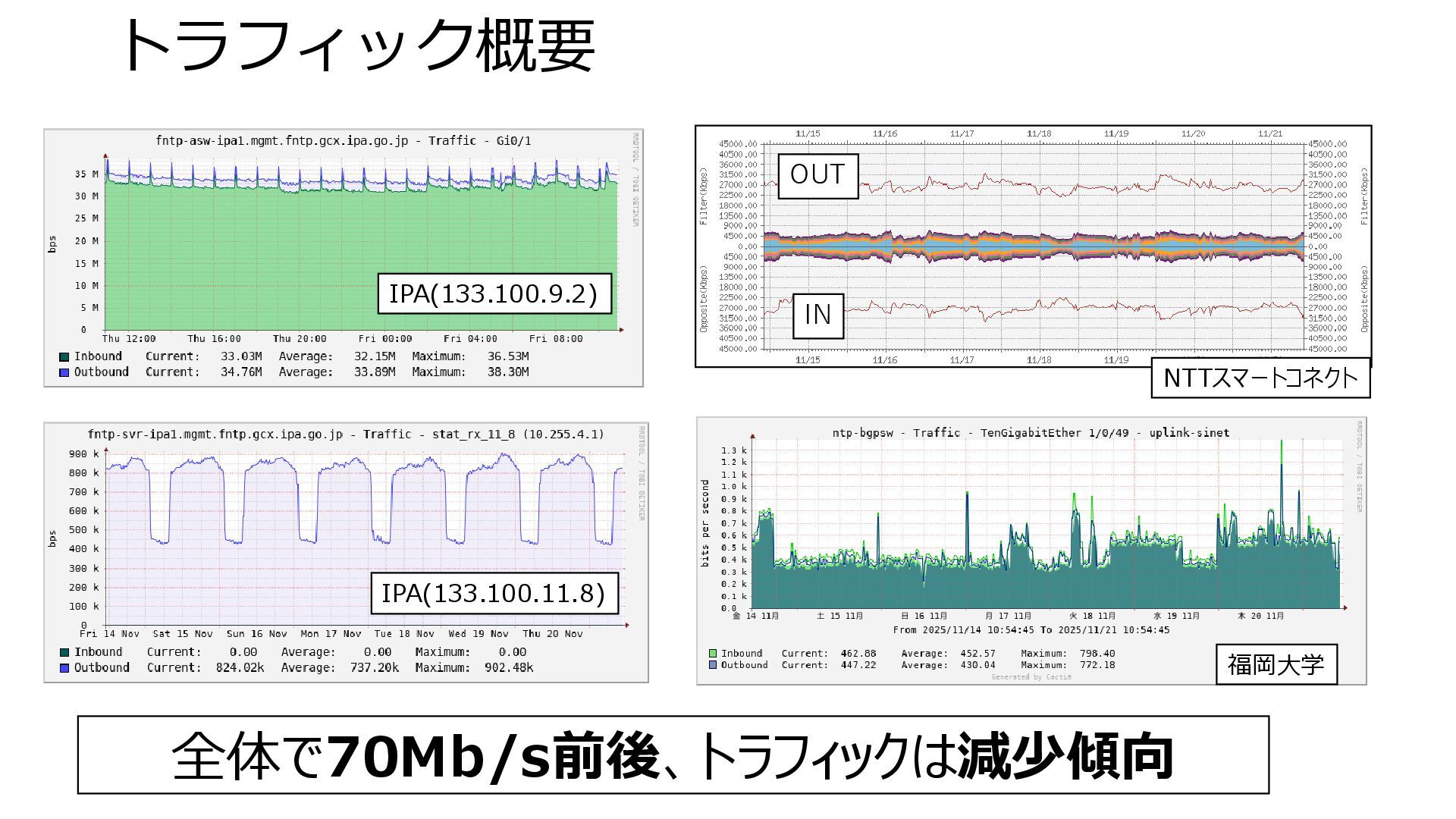 トラフィック概要 全体で70Mb/s前後、トラフィックは減少傾向 IN OUT IPA(133.100.9.2) IPA(133.100.11.8) NTTスマートコネクト 福岡大学