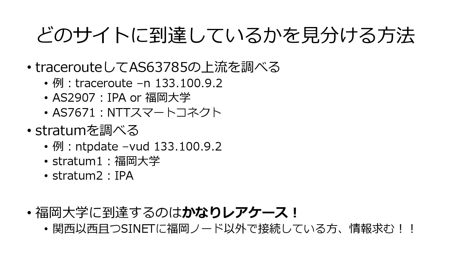 福岡大学 • AS7671:NTTスマートコネクト • stratumを調べる • 例:ntpdate –vud 133.100.9.2 • stratum1:福岡大学 • stratum2:IPA • 福岡大学に到達するのはかなりレアケース! • 関西以西且つSINETに福岡ノード以外で接続している方、情報求む!!