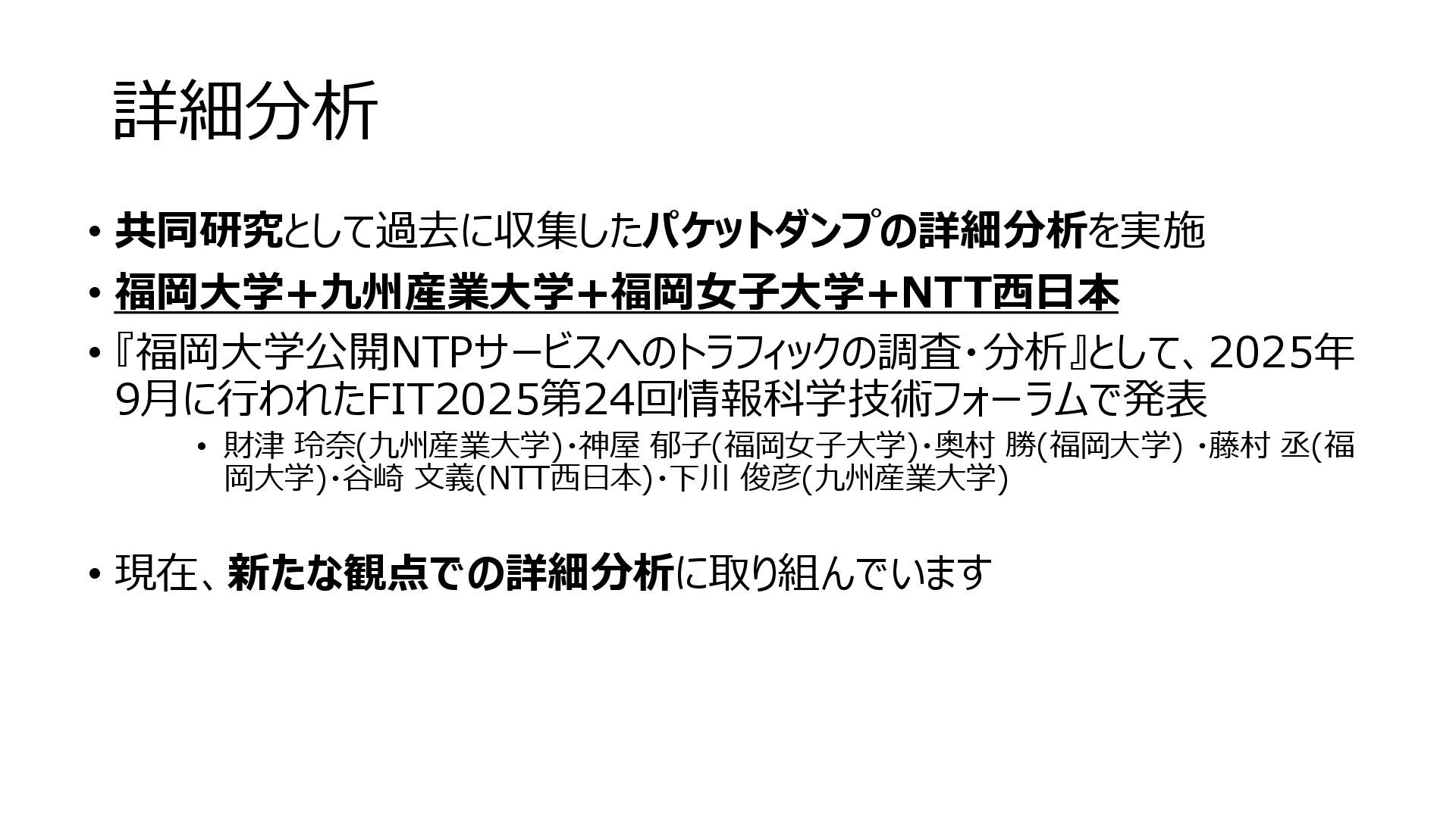 詳細分析 • 共同研究として過去に収集したパケットダンプの詳細分析を実施 • 福岡大学+九州産業大学+福岡女子大学+NTT西日本 • 『福岡大学公開NTPサービスへのトラフィックの調査・分析』として、2025年 9月に行われたFIT2025第24回情報科学技術フォーラムで発表 • 財津