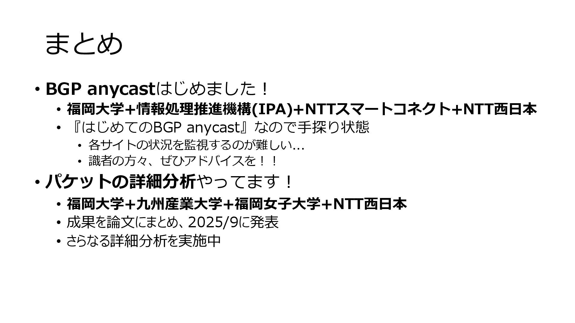 まとめ • BGP anycastはじめました! • 福岡大学+情報処理推進機構(IPA)+NTTスマートコネクト+NTT西日本 • 『はじめてのBGP anycast』なので手探り状態 •