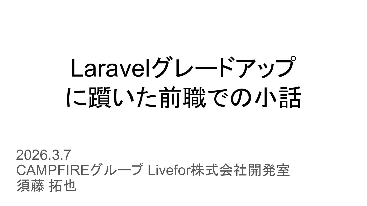2026.3.7 CAMPFIREグループ Livefor株式会社開発室 須藤 拓也 Laravelグレードアップ に躓いた前職での小話