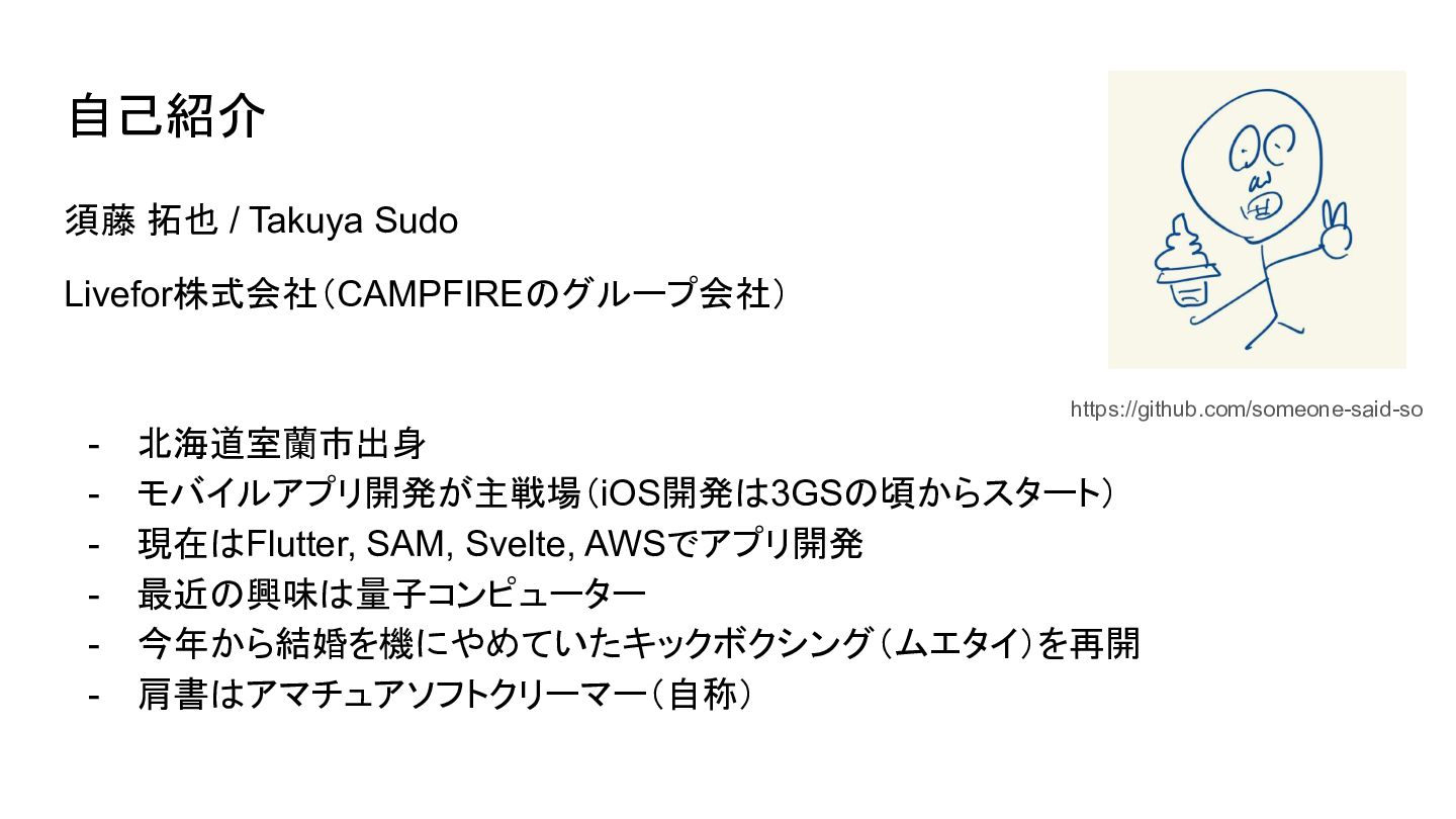 モバイルアプリ開発が主戦場(iOS開発は3GSの頃からスタート) - 現在はFlutter, SAM, Svelte, AWSでアプリ開発 - 最近の興味は量子コンピューター - 今年から結婚を機にやめていたキックボクシング(ムエタイ)を再開 - 肩書はアマチュアソフトクリーマー(自称) https://github.com/someone-said-so