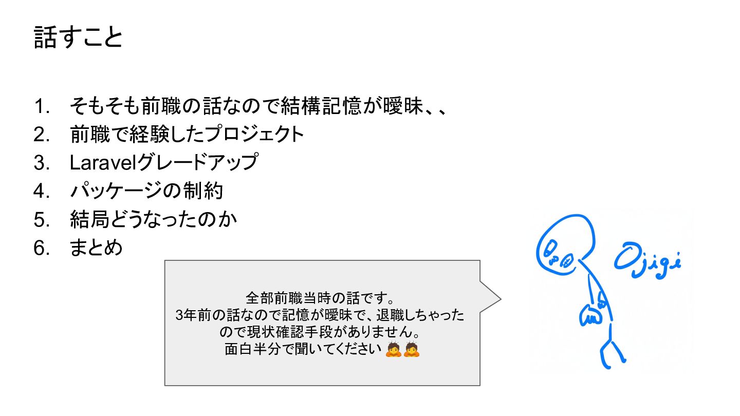 話すこと 1. そもそも前職の話なので結構記憶が曖昧、、 2. 前職で経験したプロジェクト 3. Laravelグレードアップ 4. パッケージの制約 5.