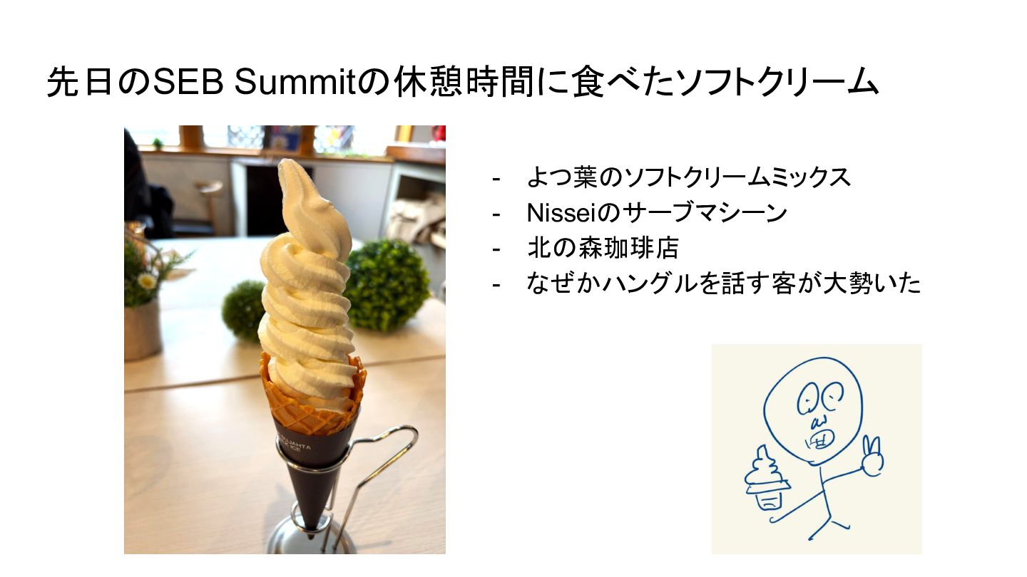 先日のSEB Summitの休憩時間に食べたソフトクリーム - よつ葉のソフトクリームミックス - Nisseiのサーブマシーン - 北の森珈琲店 - なぜかハングルを話す客が大勢いた