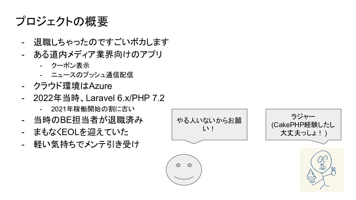 クラウド環境はAzure - 2022年当時、Laravel 6.x/PHP 7.2 - 2021年稼働開始の割に古い - 当時のBE担当者が退職済み - まもなくEOLを迎えていた - 軽い気持ちでメンテ引き受け やる人いないからお願 い! ラジャー (CakePHP経験したし 大丈夫っしょ!)