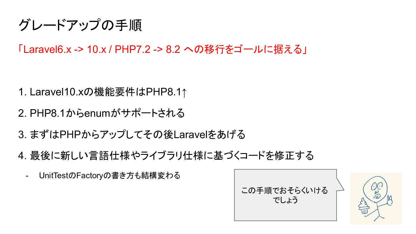 Laravel10.xの機能要件はPHP8.1↑ 2. PHP8.1からenumがサポートされる 3. まずはPHPからアップしてその後Laravelをあげる 4. 最後に新しい言語仕様やライブラリ仕様に基づくコードを修正する - UnitTestのFactoryの書き方も結構変わる この手順でおそらくいける でしょう