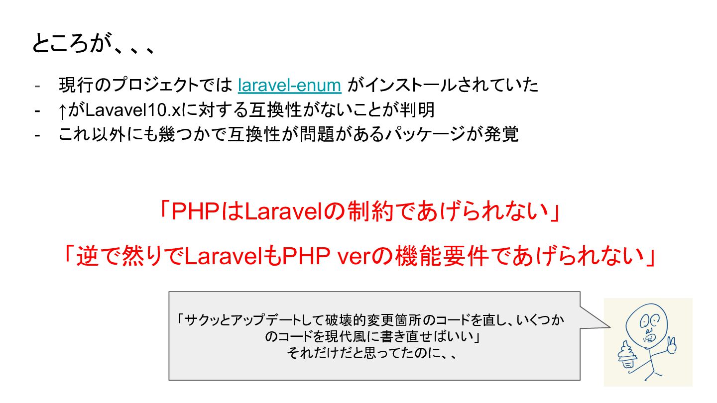 ところが、、、 - 現行のプロジェクトでは laravel-enum がインストールされていた - ↑がLavavel10.xに対する互換性がないことが判明 - これ以外にも幾つかで互換性が問題があるパッケージが発覚 「PHPはLaravelの制約であげられない」