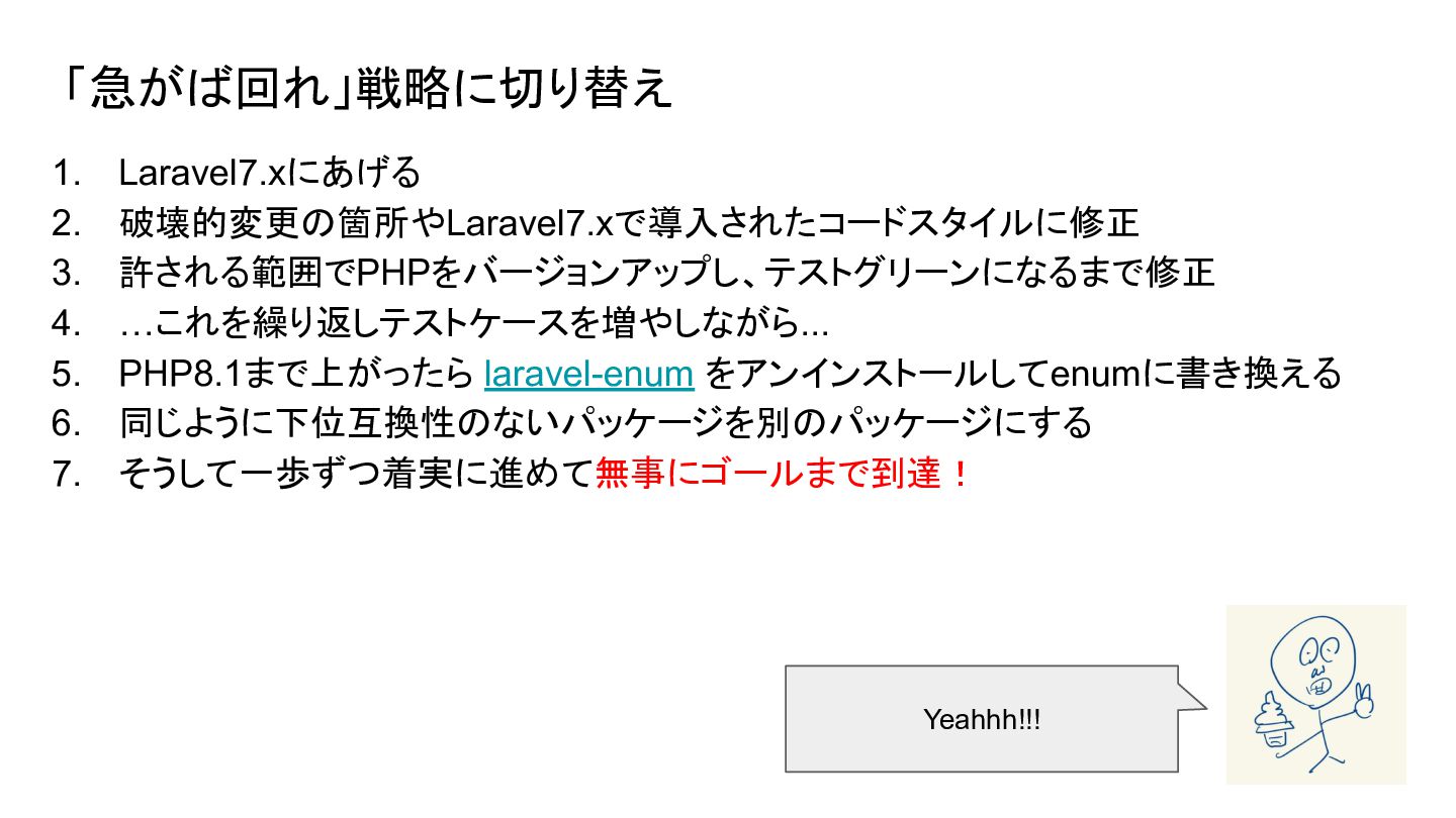 PHP8.1まで上がったら laravel-enum をアンインストールしてenumに書き換える 6. 同じように下位互換性のないパッケージを別のパッケージにする 7. そうして一歩ずつ着実に進めて無事にゴールまで到達! Yeahhh!!!